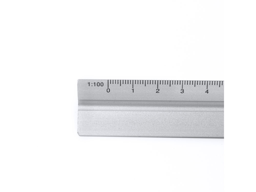 Алюминиевая линейка треугольной формы (30 см). Шкалы: 1:20, 1:25, 1:50, 1:75 и 1:100. Специальная гладкая поверхность для нанесения логотипов.
