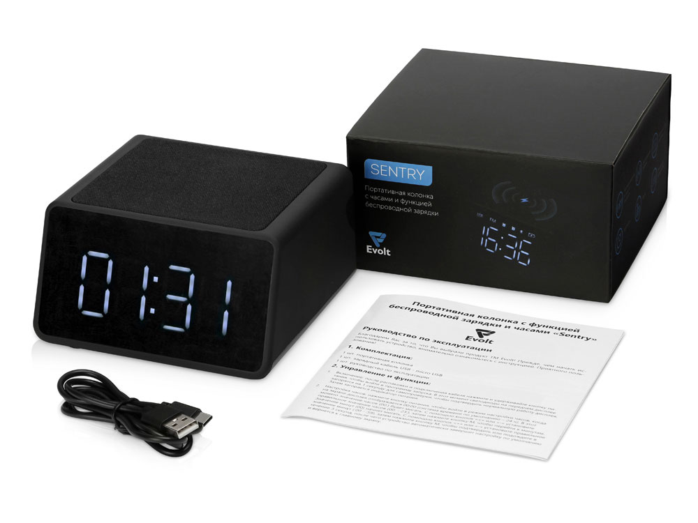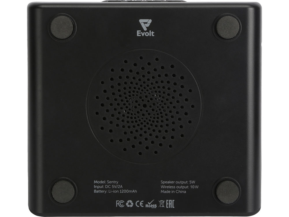 Беспроводная колонка с часами и функцией беспроводной зарядки Sentry от Evolt. Устройство может работать автономно, что позволяет использовать его в любой точке квартиры и за ее пределами и избавиться от проводов на рабочем столе. Колонка подключается к смартфону при помощи Bluetooth, имеет большой динамик, занимающий собой всю нижнюю панель Sentry. Передняя зеркальная панель выступает в роли циферблата: во включенном виде на ней проявляются цифры и статусы. При настройке будильника вы можете выбрать одну из пяти мелодий или установить радио в качестве сигнала. Sentry предусматривает возможность установки двух будильников на разное время, а также можно повторить сигнал через 5 минут. Колонка заряжается от сети, при подключении к ней Sentry можно использовать беспроводную зарядку: положите ваш смартфон поверх колонки, и устройство автоматически начнет заряжаться. В автономном режиме функции беспроводной зарядки и радио не активизируется в целях сохранения батареи. - беспроводная, работает автономно - радио - интересный дизайн с зеркальным дисплеем - будильник с 5 мелодиями, возможно добавить 2 будильника на разное время, удобная кнопка повтора сигнала через 5 минут - большой динамик - функция беспроводной зарядки