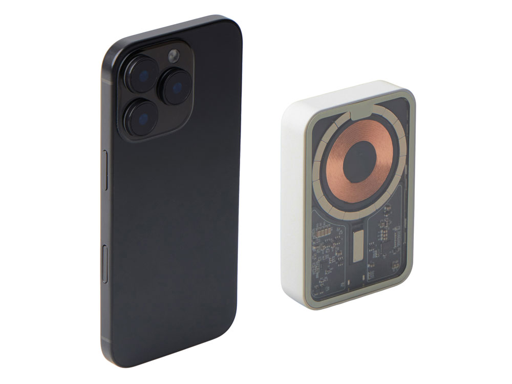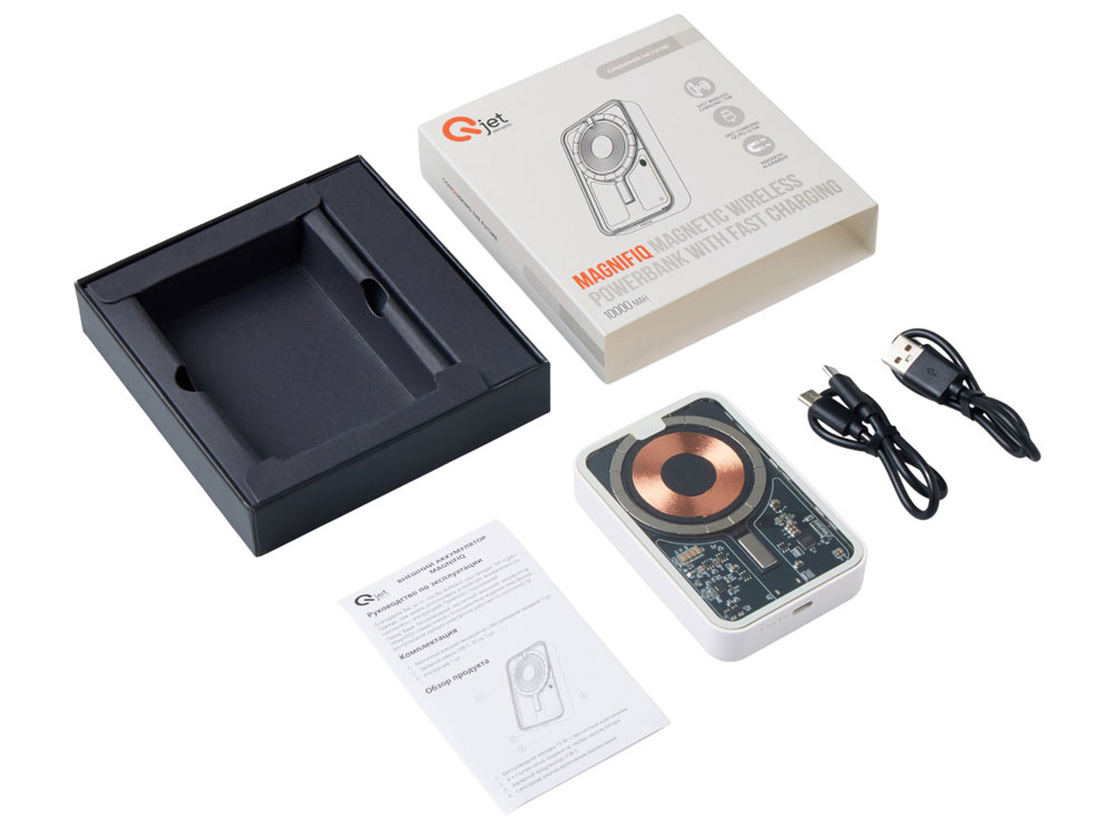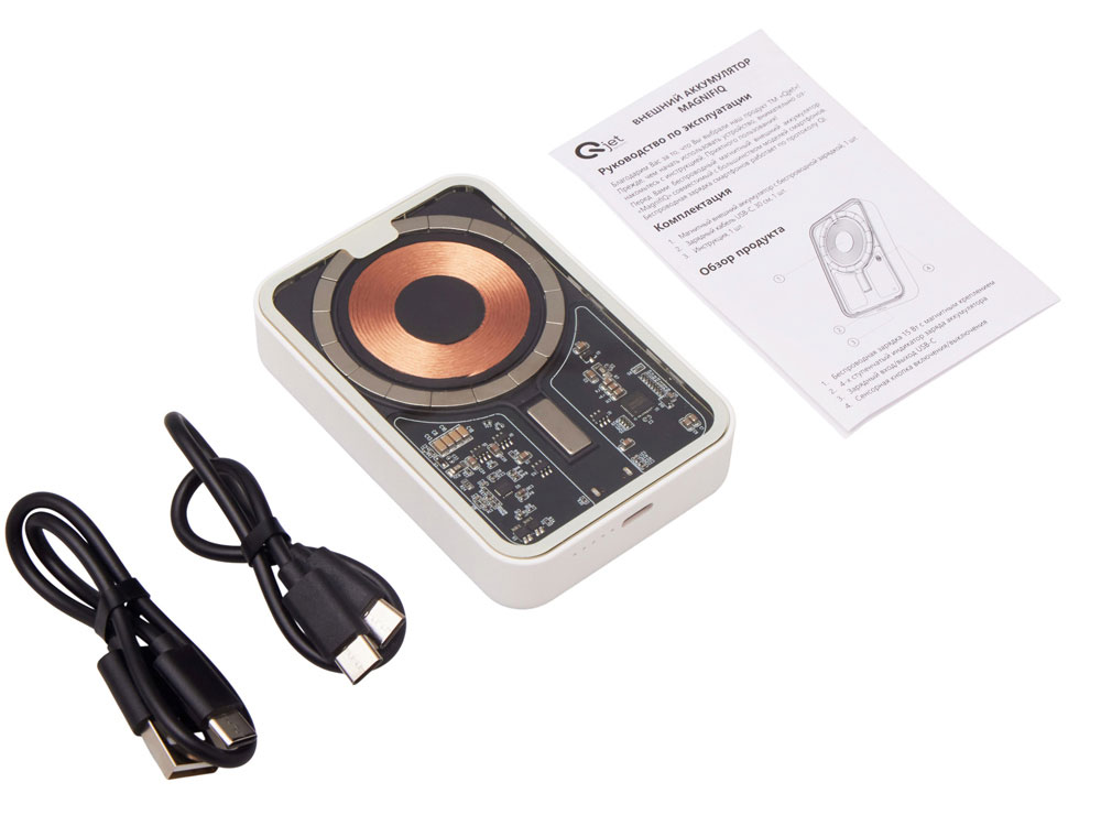 Беспроводной магнитный внешний аккумулятор MagnifIQ — технологичный и стильный power bank с эффектной прозрачной передней панелью, сквозь которую видны мощные магниты, индукционная катушка и электронная начинка. Ёмкость 10 000 мА·ч обеспечивает до 2–3 полных зарядов смартфона, а поддержка быстрой беспроводной зарядки до 15 Вт (с совместимостью QC/PD) делает процесс зарядки максимально быстрым и удобным. Двунаправленный USB-C порт позволяет как заряжать другие устройства, так и сам аккумулятор. Обе стороны корпуса подходят для нанесения логотипа: лицевая — через прозрачную панель, задняя — на приятное на ощупь soft-touch покрытие. Компактный, надёжный и сильный — идеальный технологичный продукт для продвижения и ежедневного использования. Поставляется в качественной упаковке с шубером, Двунаправленный кабель USB-C и кабель USB-A – USB-C в комплекте. • Прозрачная передняя панель — демонстрирует внутреннюю начинку и подчеркивает технологичность бренда. • Магнитная беспроводная зарядка 15 Вт • Ёмкость 10 000 мА·ч — хватает на несколько полных зарядов смартфона. • Двунаправленный USB-C — универсальность для зарядки и подзарядки. • Две зоны нанесения логотипа: на прозрачную панель спереди и на soft-touch покрытие сзади. • Сильные магниты обеспечивают надёжную фиксацию на совместимых устройствах.