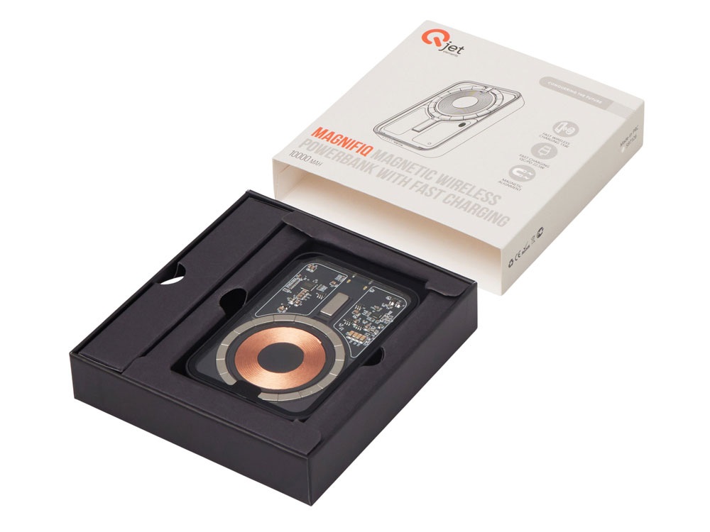 Беспроводной магнитный внешний аккумулятор MagnifIQ — технологичный и стильный power bank с эффектной прозрачной передней панелью, сквозь которую видны мощные магниты, индукционная катушка и электронная начинка. Ёмкость 10 000 мА·ч обеспечивает до 2–3 полных зарядов смартфона, а поддержка быстрой беспроводной зарядки до 15 Вт (с совместимостью QC/PD) делает процесс зарядки максимально быстрым и удобным. Двунаправленный USB-C порт позволяет как заряжать другие устройства, так и сам аккумулятор. Обе стороны корпуса подходят для нанесения логотипа: лицевая — через прозрачную панель, задняя — на приятное на ощупь soft-touch покрытие. Компактный, надёжный и сильный — идеальный технологичный продукт для продвижения и ежедневного использования. Поставляется в качественной упаковке с шубером, Двунаправленный кабель USB-C и кабель USB-A – USB-C в комплекте. • Прозрачная передняя панель — демонстрирует внутреннюю начинку и подчеркивает технологичность бренда. • Магнитная беспроводная зарядка 15 Вт • Ёмкость 10 000 мА·ч — хватает на несколько полных зарядов смартфона. • Двунаправленный USB-C — универсальность для зарядки и подзарядки. • Две зоны нанесения логотипа: на прозрачную панель спереди и на soft-touch покрытие сзади. • Сильные магниты обеспечивают надёжную фиксацию на совместимых устройствах.