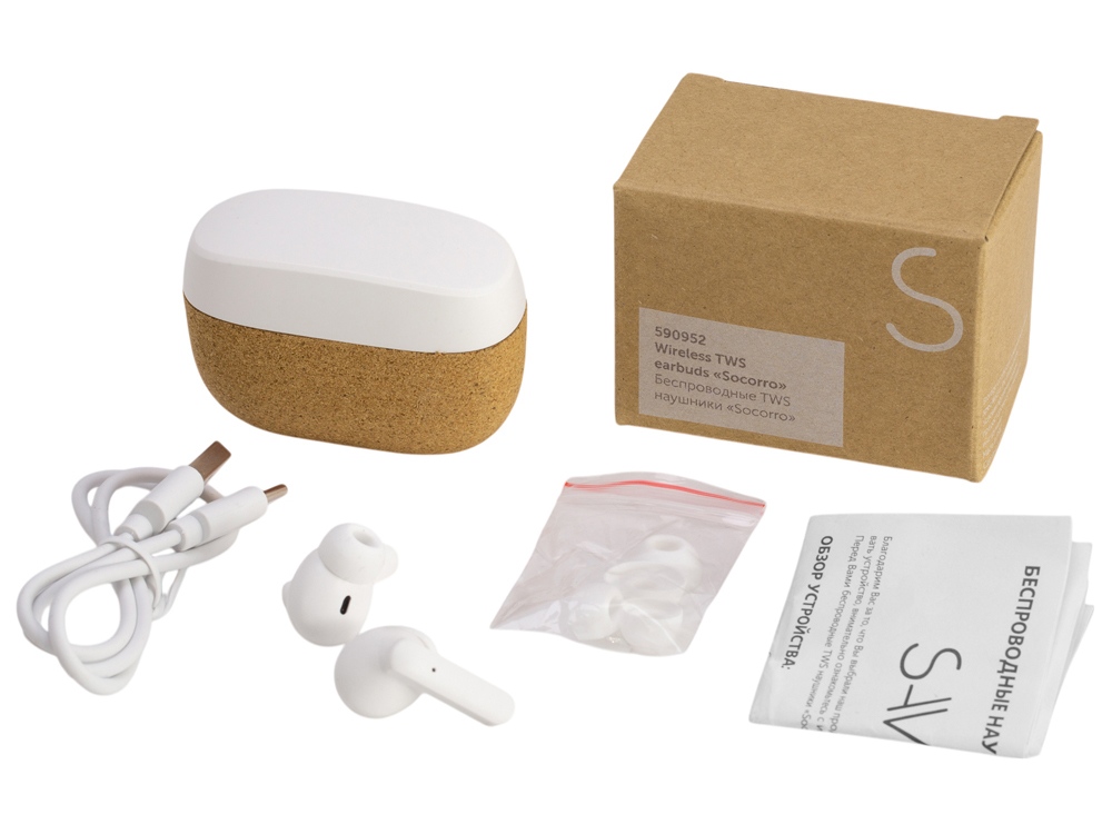 Стильные беспроводные наушники Socorro сочетают экологичность с передовыми технологиями. Изготовлены из переработанного ABS-пластика и натуральной пробки. Чипсет с поддержкой Bluetooth 5.0 обеспечивает качественную передачу музыки и стабильное соединение. Наушники предназначены для прослушивания музыки, но с ними можно ответить и на входящий звонок, нажав 1 раз на наушнике. • Переработанный ABS-пластик и натуральная пробка • До 4 часов работы на одном заряде наушников и до 16 часов с учетом кейса • Bluetooth 5.0 обеспечивает связь на расстоянии до 10 метров. • Комфорт и функциональность: Силиконовые вкладыши 3-х размеров, встроенный микрофон для звонков, отсутствие ПВХ в составе. Идеальный выбор для тех, кто ценит прогрессивный дизайн и надежную работу в повседневной жизни. Наушники поставляются в крафтовой упаковке с запасными амбушюрами и зарядным кабелем USB Type-C.