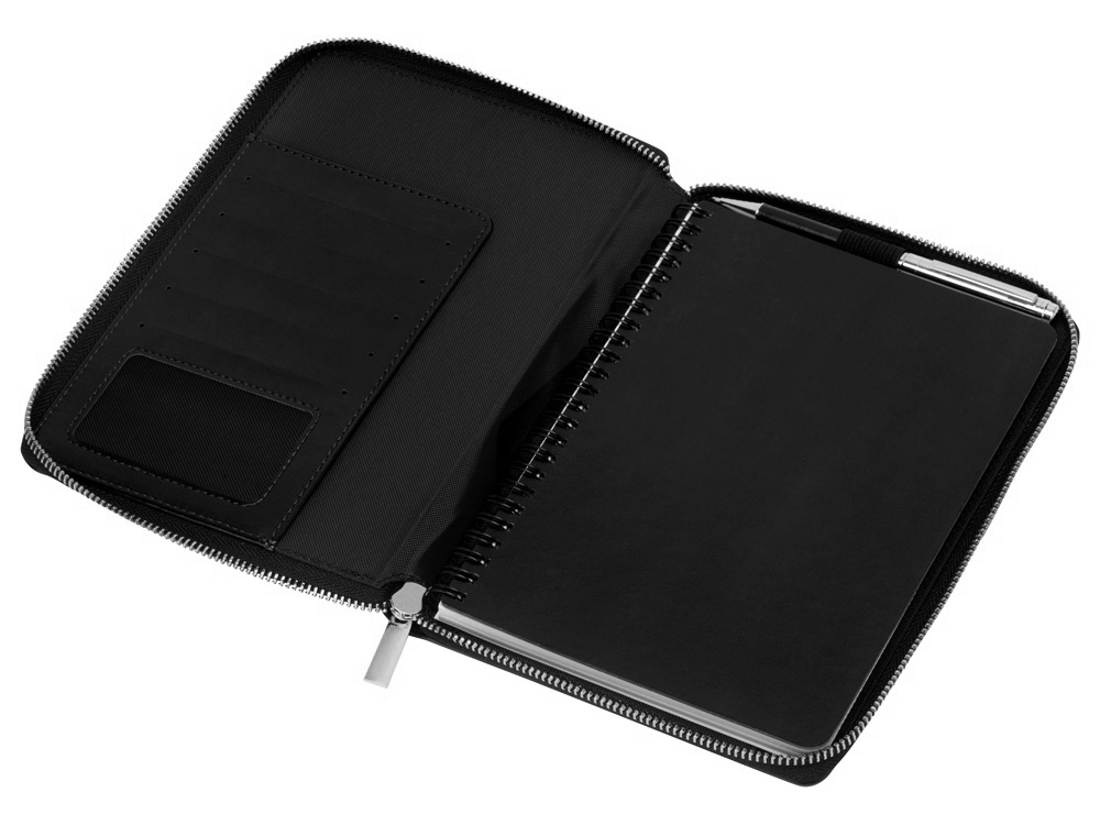 Бизнес блокнот Fabrizio состоит из пенала на молнии выполненного из искусственной кожи, и сменной тетради на 80 листов на кольцах с перфорированными линованными листами белого цвета. Блокнот снабжен 5 отделениями для карт и RFID защитой, которая охраняет вашу личную и финансовую информацию от мошенников. Внутри блокнота есть петля для ручки в тон (ручка в комплект не входит).