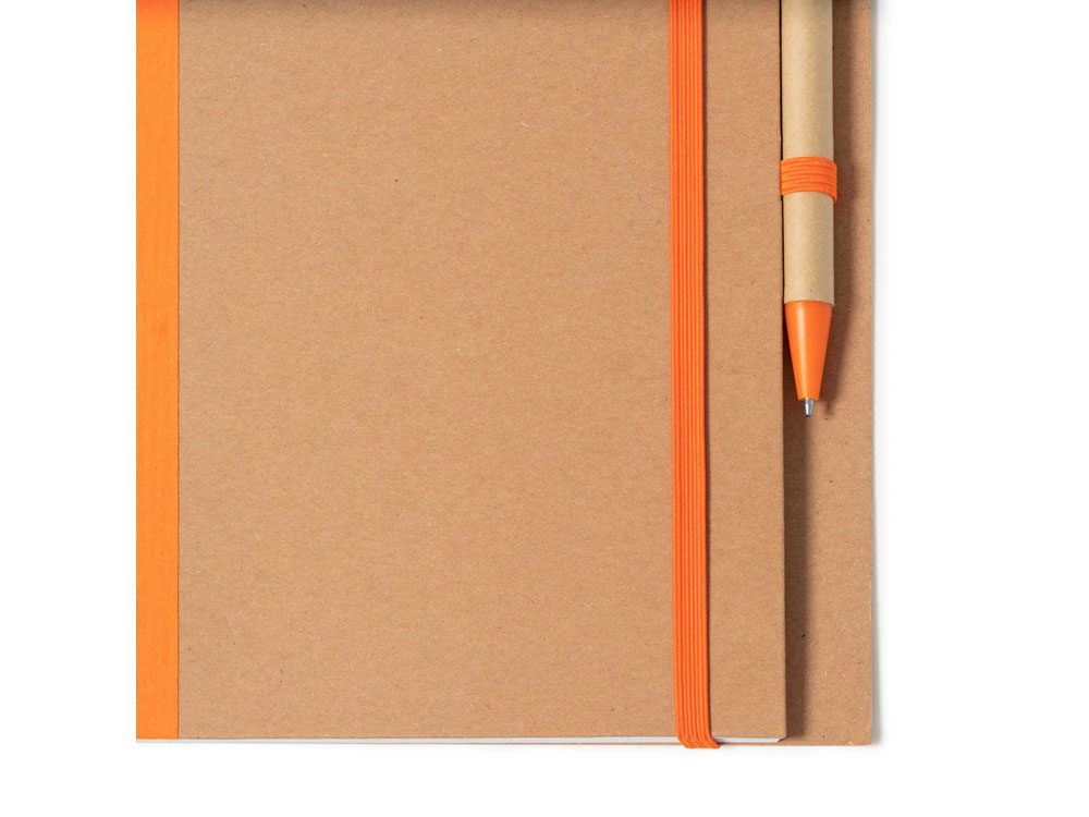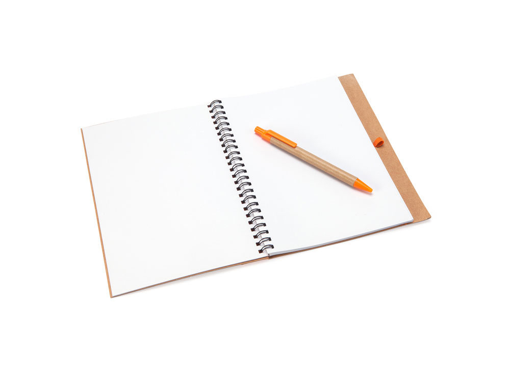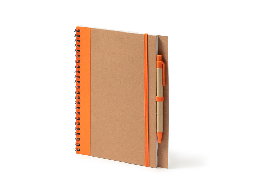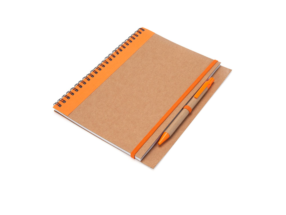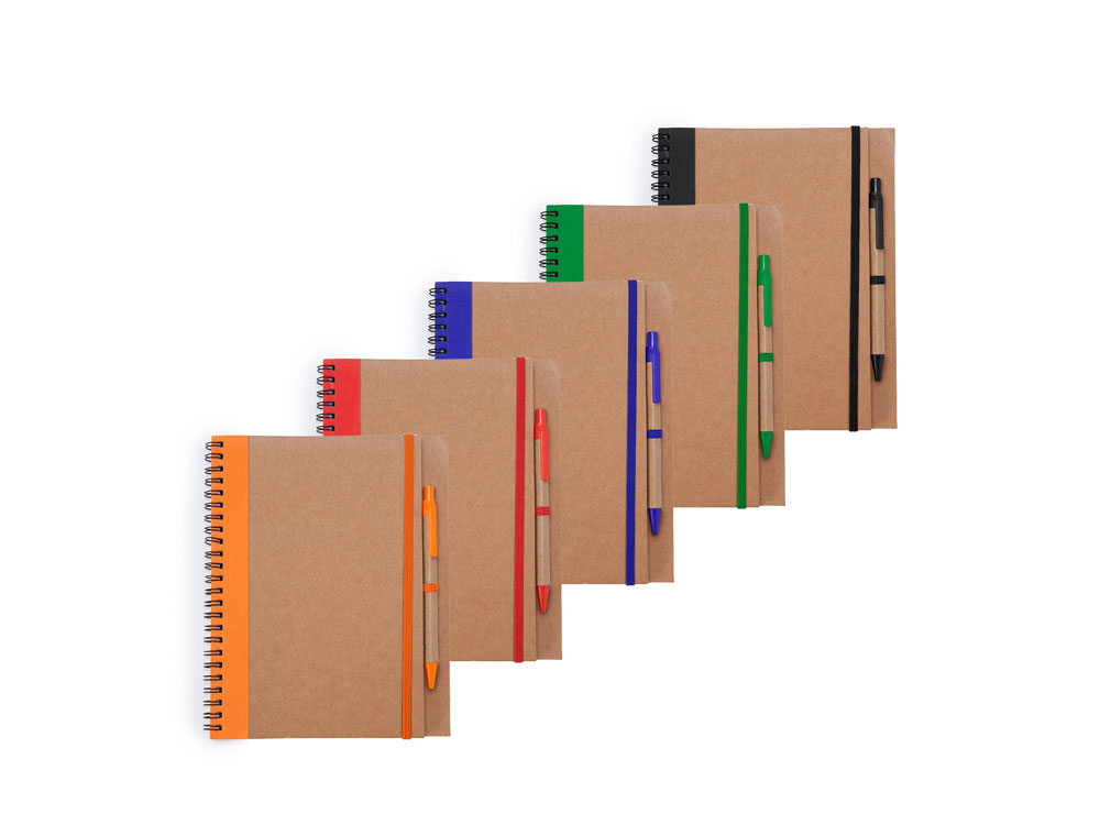 Блокнот на спирали с жесткой обложкой из переработанного картона. Включает шариковую ручку с синими чернилами. 60 простых листов.