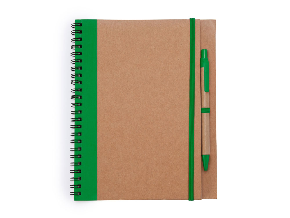 Блокнот на спирали с жесткой обложкой из переработанного картона. Включает шариковую ручку с синими чернилами. 60 простых листов.