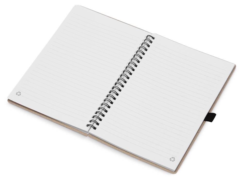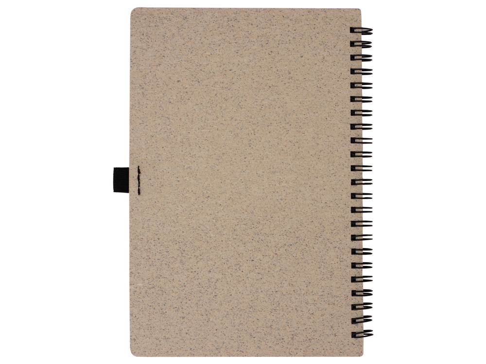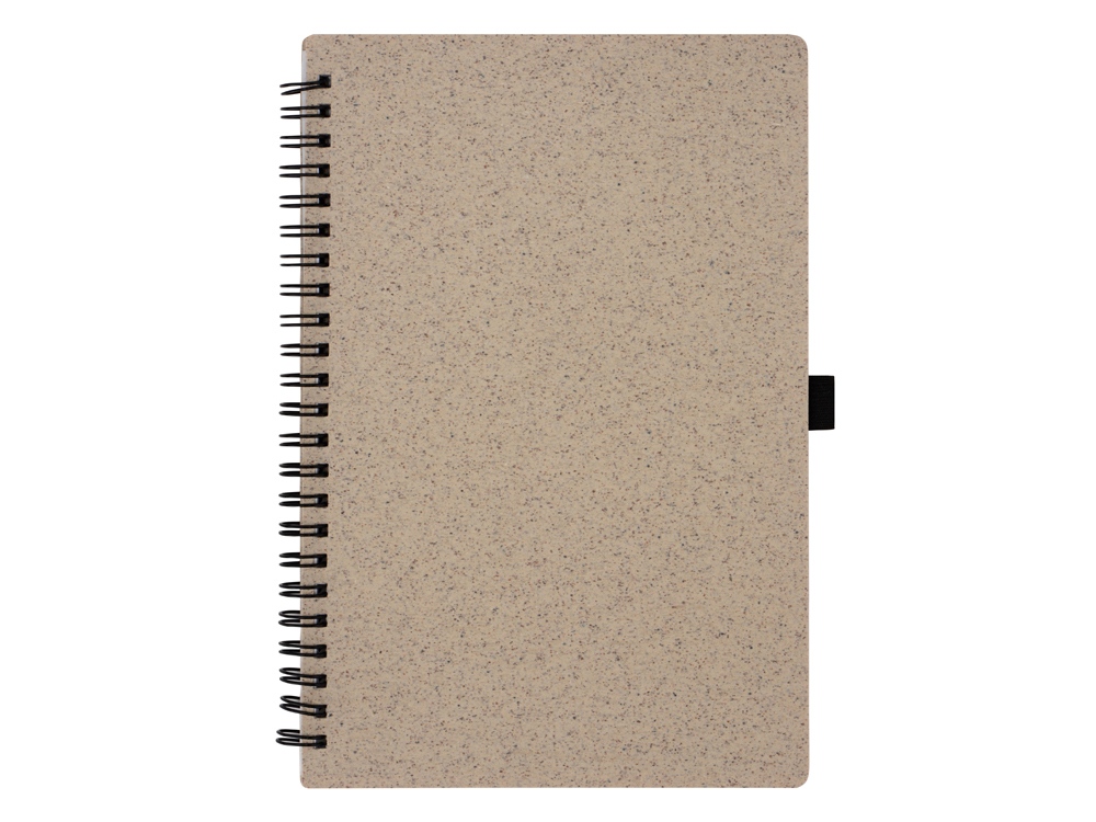 Блокнот с обложкой из переработанной пшеницы и пластика. Блок состоит из 70 листов переработанной бумаги белого цвета. Крепление - пружина. Дополнен петлей для ручки.