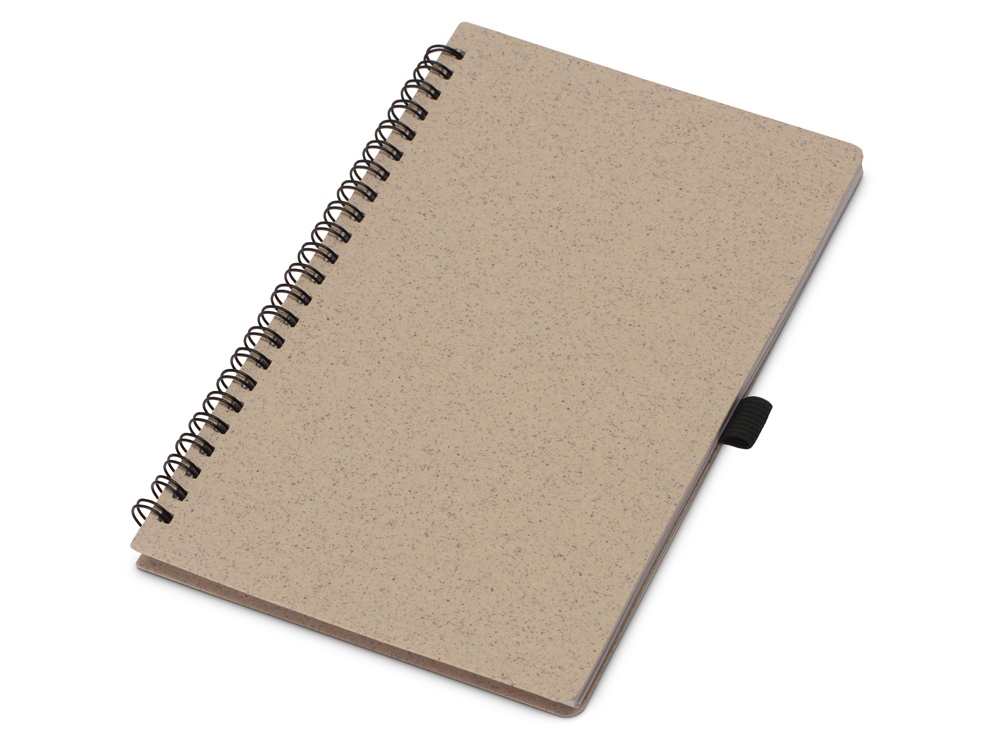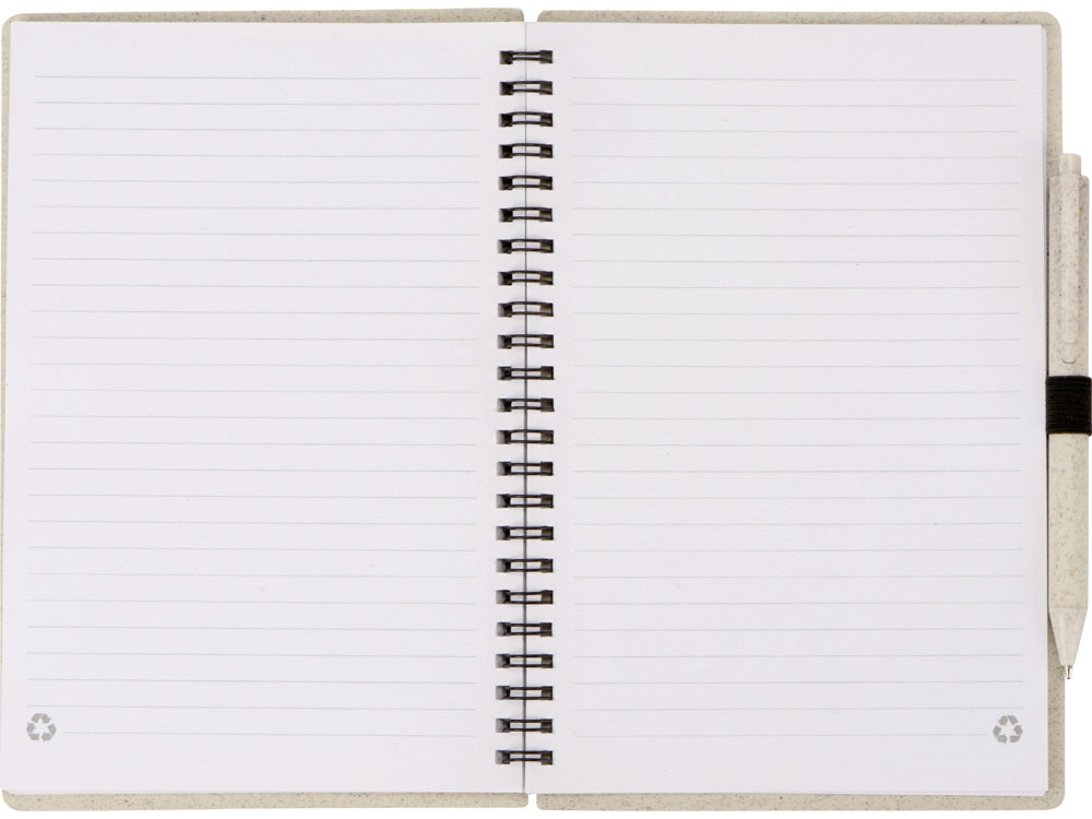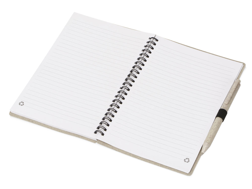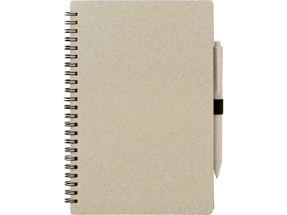 Блокнот с обложкой из переработанной пшеницы и пластика. Блок состоит из 80 листов переработанной бумаги белого цвета. Крепление - пружина. В комплекте шариковая ручка в тон блокноту из пшеничной соломы.