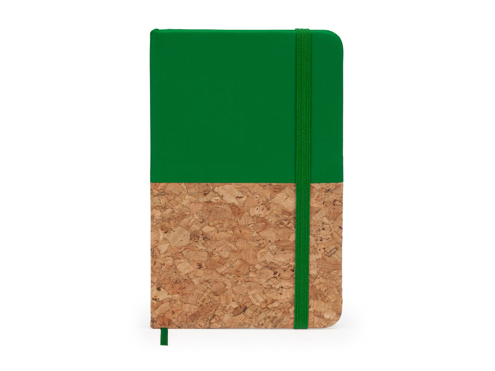 Блокнот формата А6. Комбинированная обложка из искусственной кожи и пробки. 80 нелинованных листов. Также у блокнота есть ляссе и резинка для фиксации.