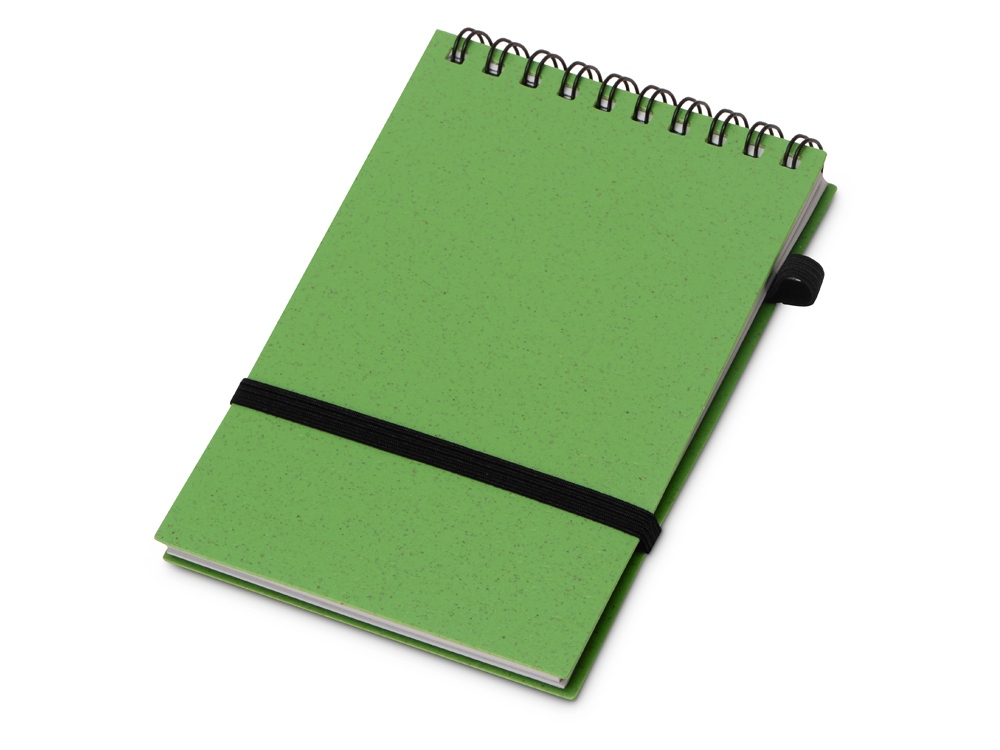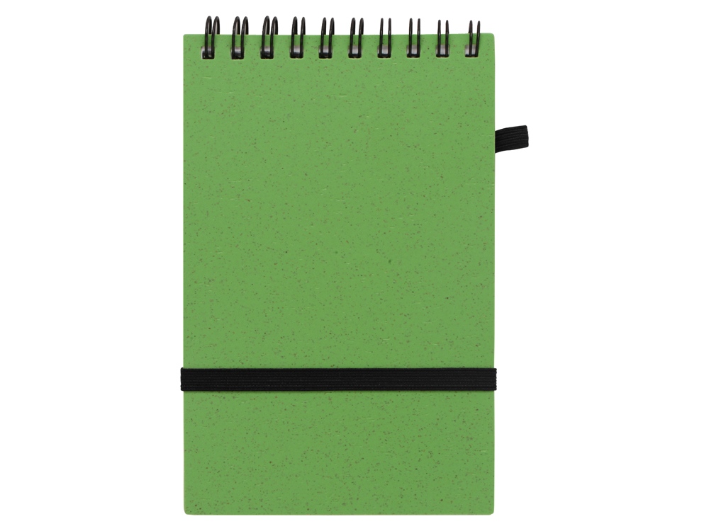 Блокнот с обложкой из переработанной пшеницы и пластика. Блок состоит из 60 листов переработанной бумаги белого цвета. Крепление - пружина. Дополнен петлей для ручки и горизонтальной резинкой.