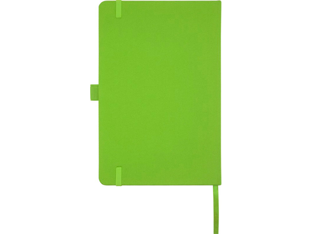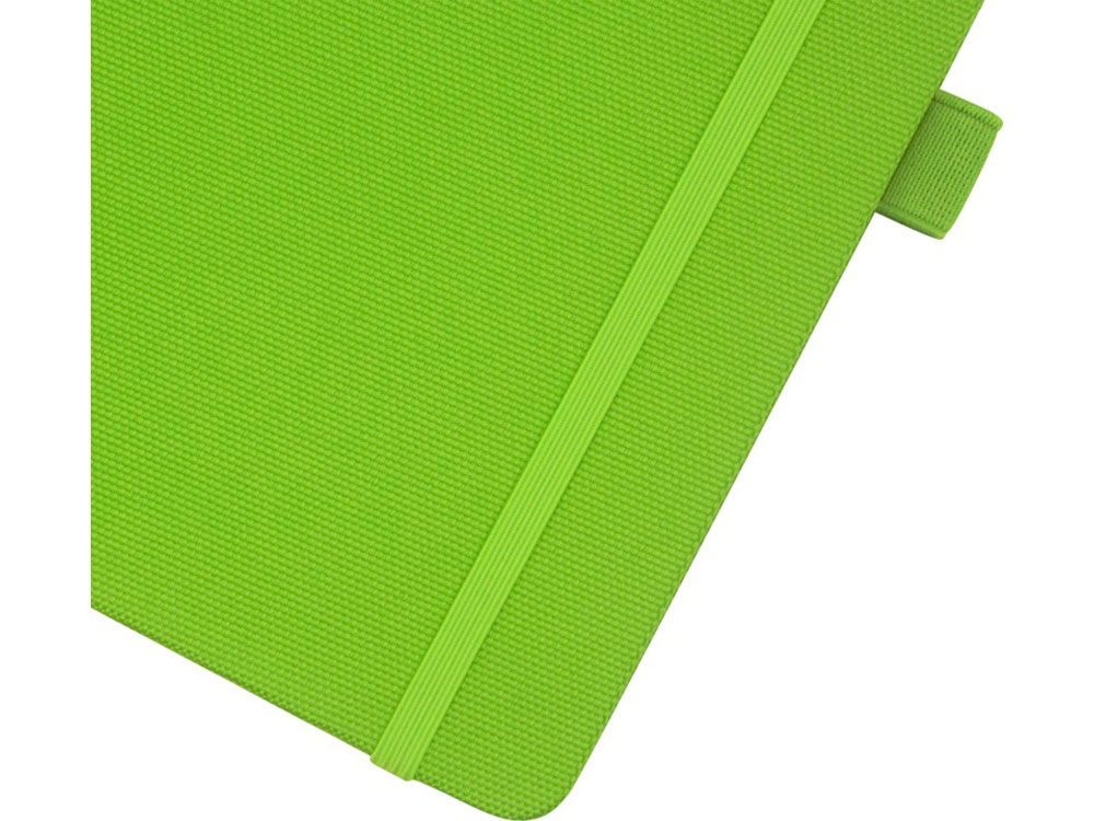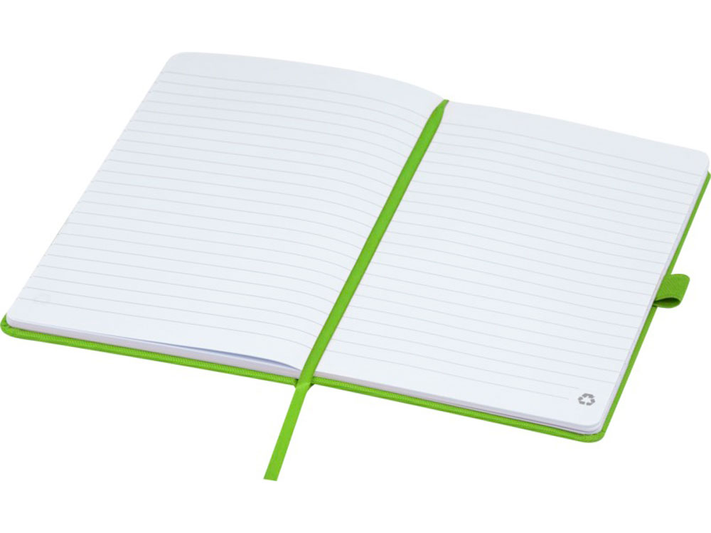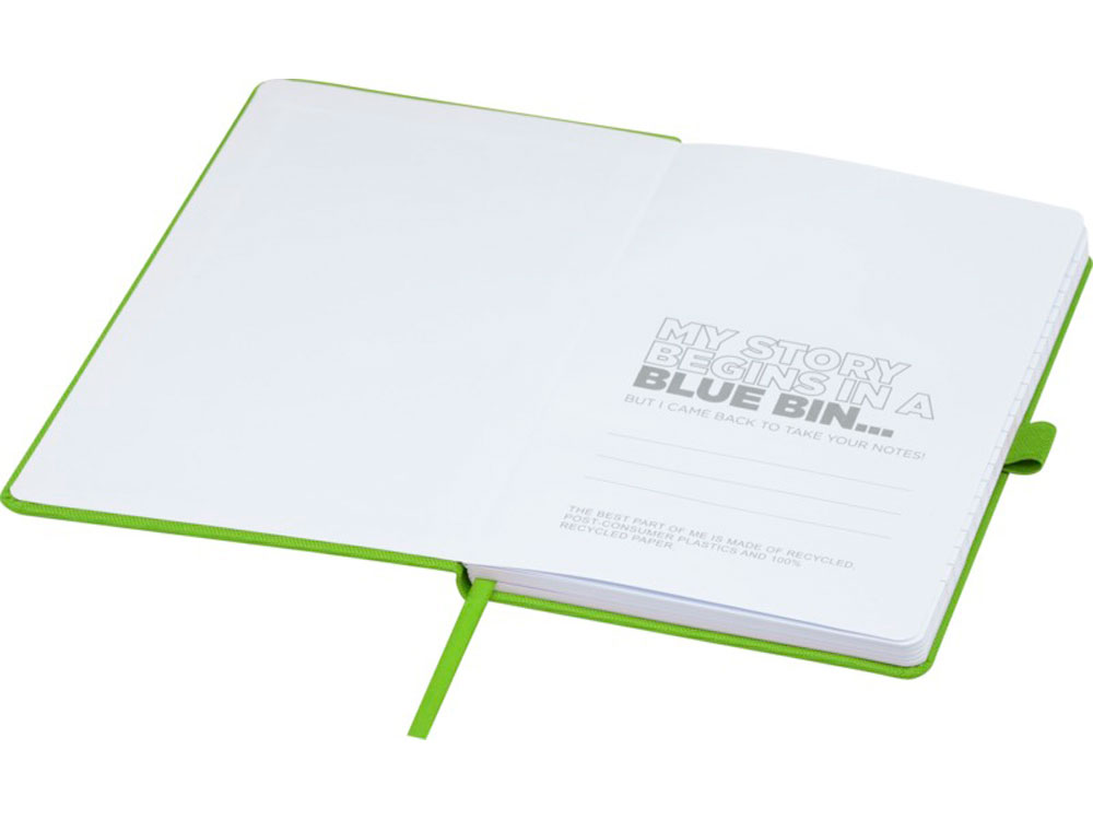 Блокнот формата А5 с обложкой из переработанного ПЭТ. Содержит 80 листов в линию плотностью 70 г/м², изготовленных из переработанной бумаги, с петлей для ручки и лентой-закладкой. Может быть дополнен шариковой ручкой Honua 107757 из переработанного ПЭТ. Переработанный PET пластик.