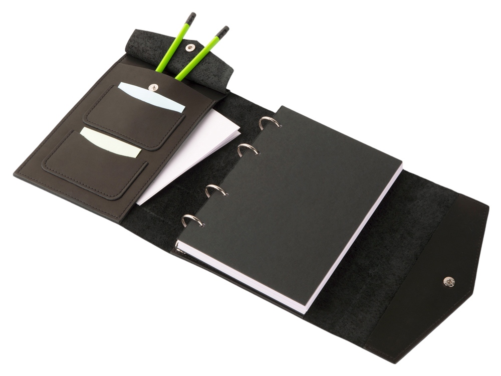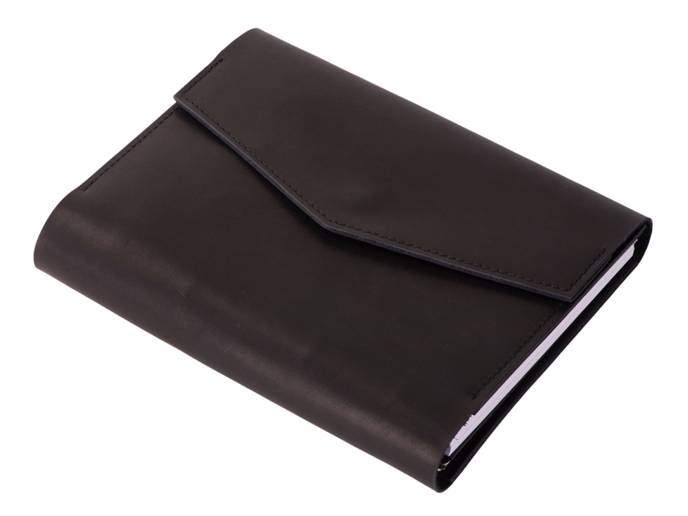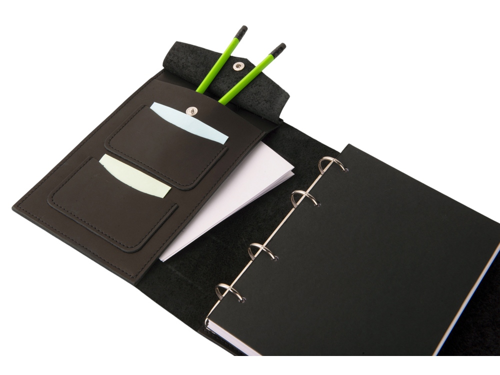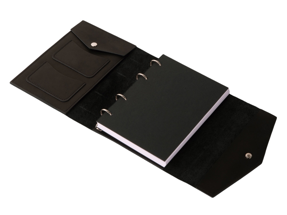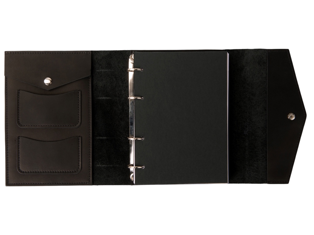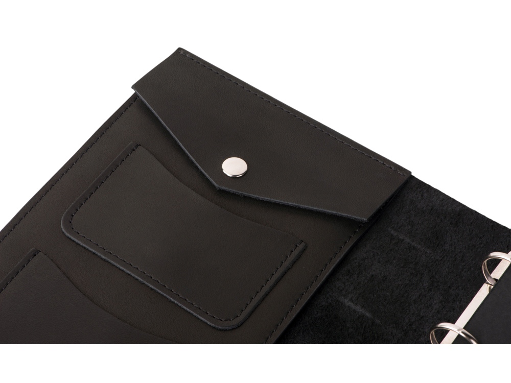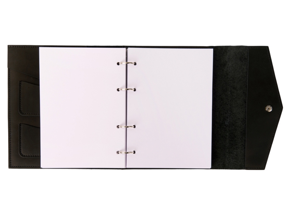 Кожаный блокнот на кольцах формата А5 со сменными блоками. Имеет два маленьких кармашка, один карман большой и карман на кнопке для ручек. Вместе с бумажным блоком в комплекте идут вставки из плотного картона. Они позволяют блокноту лучше держать форму и делать записи даже на весу. Формат листов А5 стандартный и вы без проблем сможете заменить бумажный блок на новый. По- этому блокнот прослужит вам долгие годы. Бумажный блок состоит из 100 нелинованных листов формата А5 (15-21см).