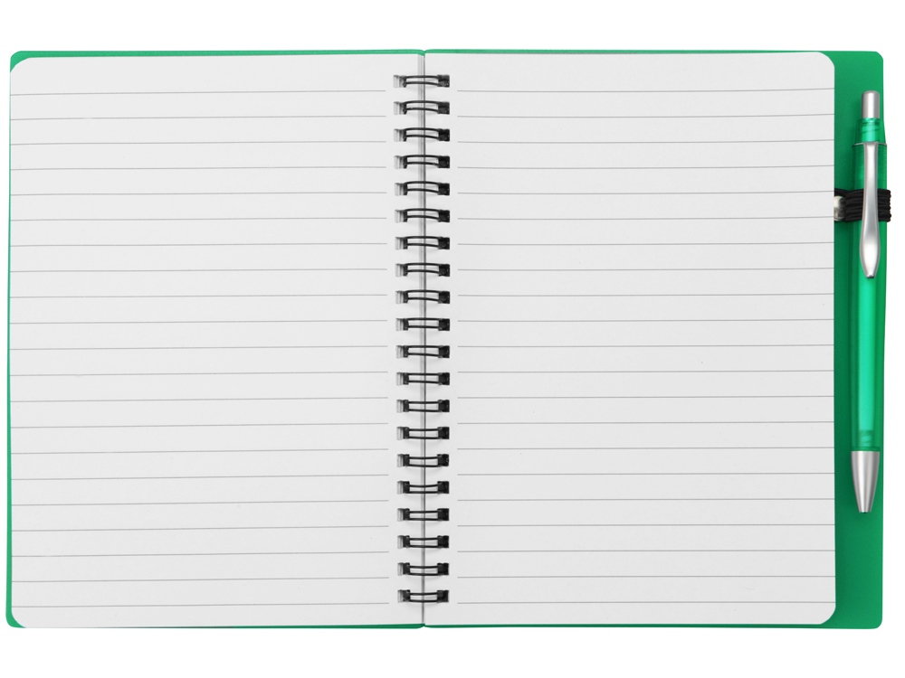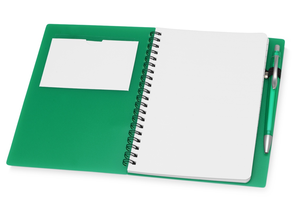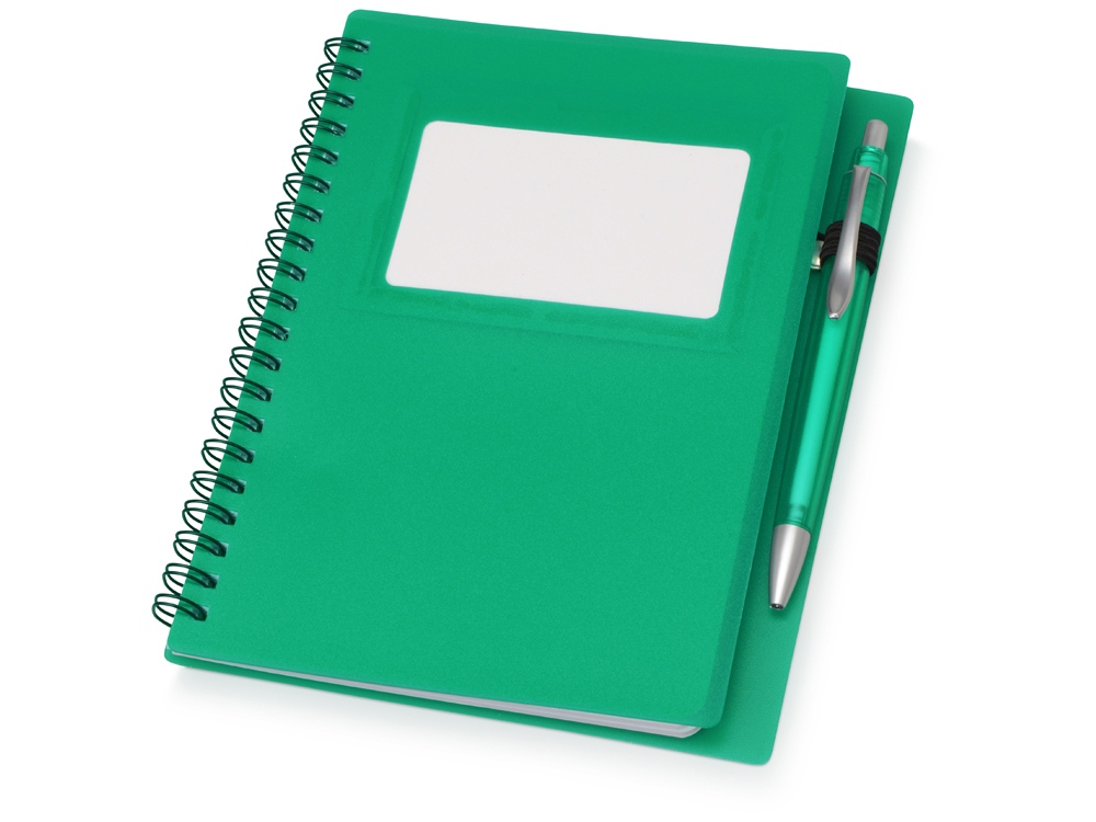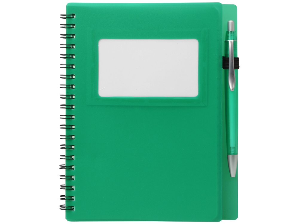 Блокнот Контакт в полипропиленовой обложке переплетен на пружине. В обложке блокнота предусмотрено окошко, в которое можно поместить визитную карточку или полиграфическую вставку. В комплекте с блокнотом идет ручка, которая вставляется в петельку сбоку. Размер окошка внешний 8,4 х 4,8 см, внутренний 10 х 6,5 см.