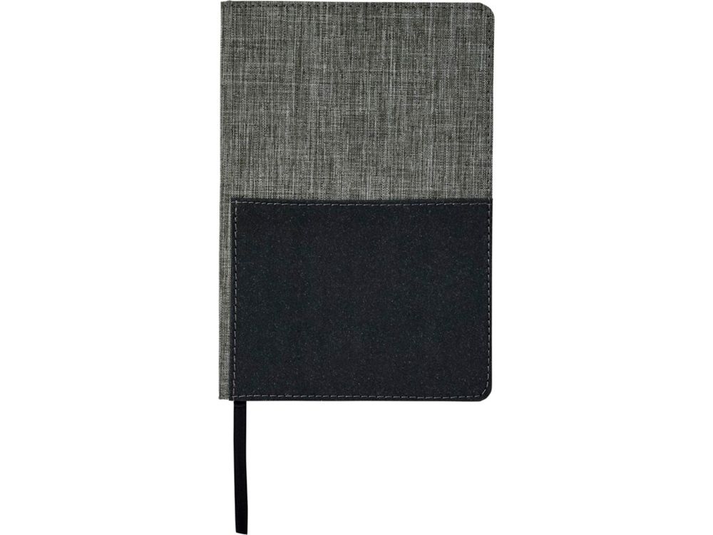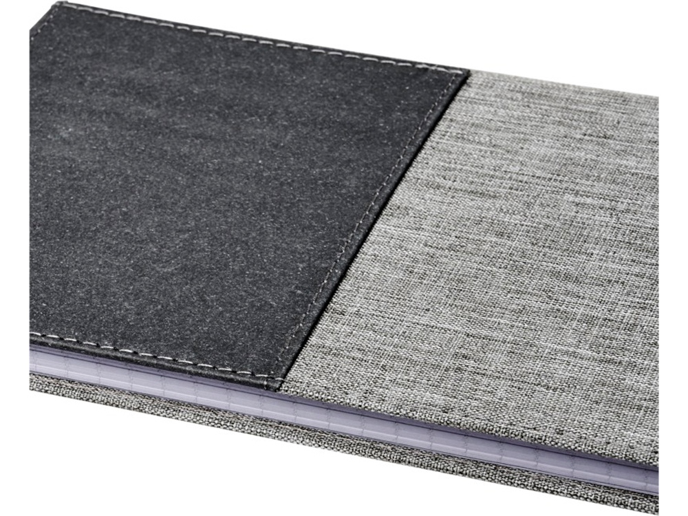 Блокнот размера А5 с обложкой серо-лилового цвета из б/у пластмассы (70 %), картона из переработанной бумаги (100 %) с передним карманом из 100 % остатков переработанной кожи. В кармане может поместиться смартфон, шариковая ручка и другие мелкие предметы. Блокнот состоит из 80 листов бумаги 80 г/см в линейку и упакован в черную подарочную коробку. Ткань, картон, переработанная кожа.