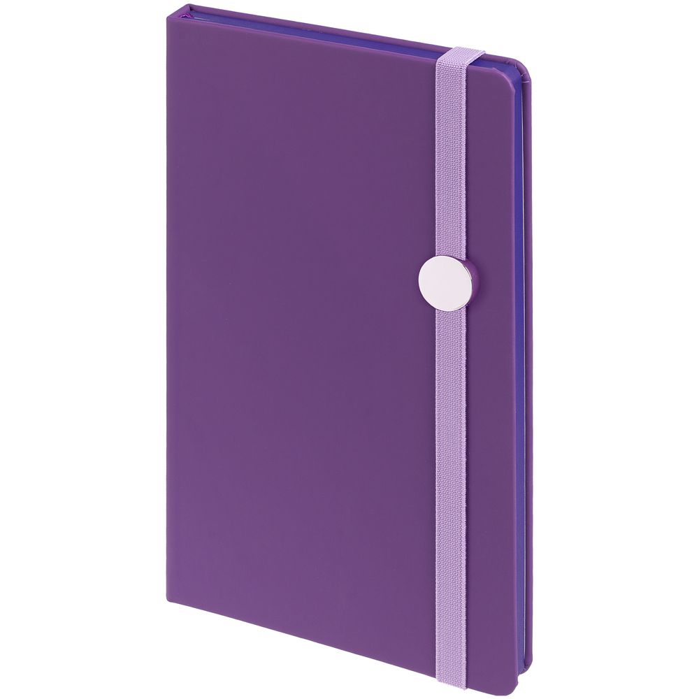 Блокнот в твердой обложке, выполнен из материала Soft Touch, фиолетовый UU, дополнен резинкой и ляссе в цвет обложки.