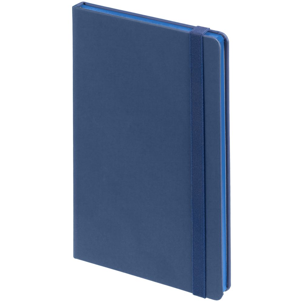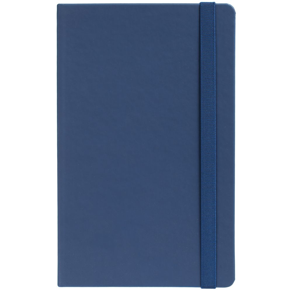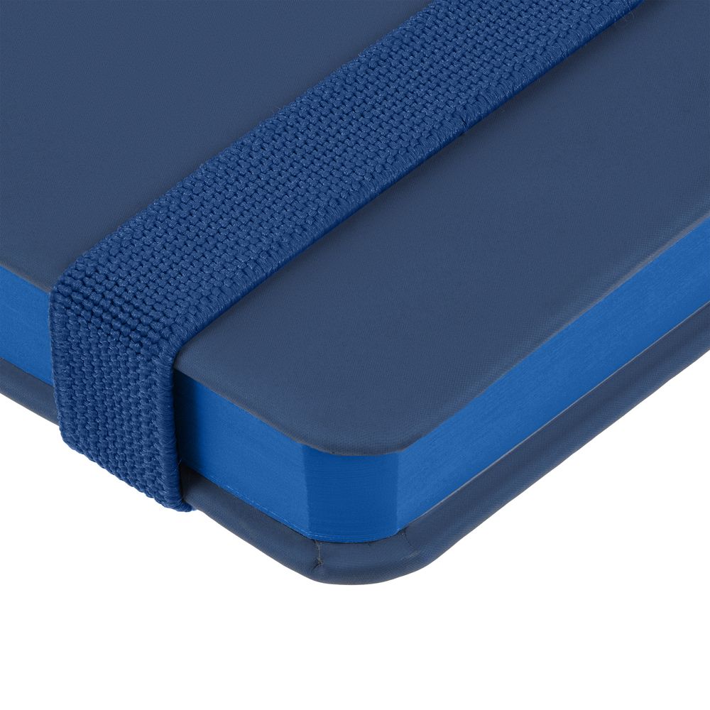 Блокнот в твердой обложке, выполнен из материала Soft Touch Pearl, синий НН, дополнен резинкой и ляссе в цвет обложки.