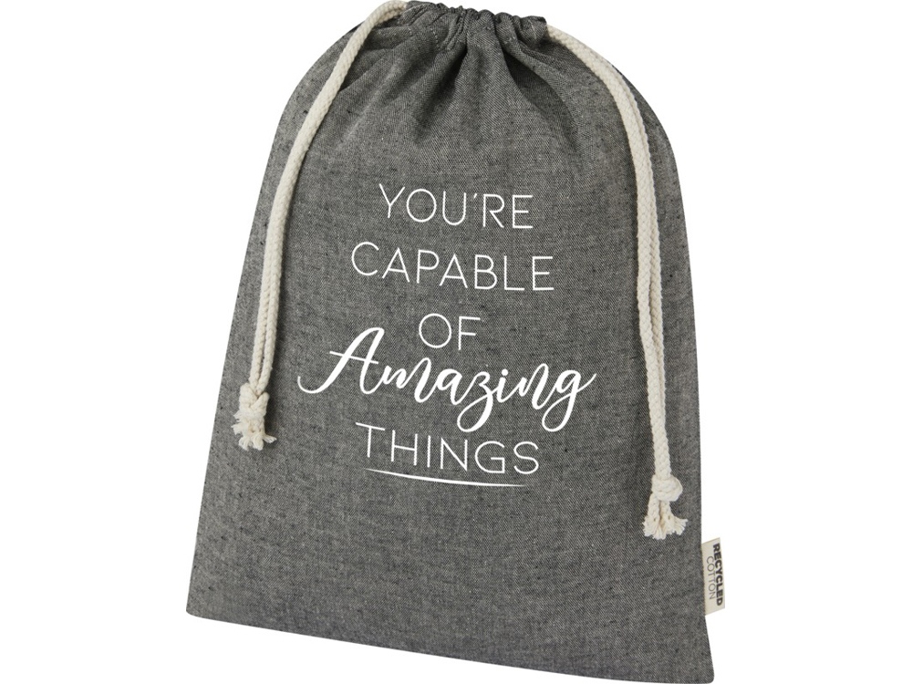Подарочная сумка из хлопка, переработанного по стандарту GRS, с хлопковым шнурком для затягивания. Идеально подходит для подарков или хранения предметов. Размер: 30 x 42 см.
