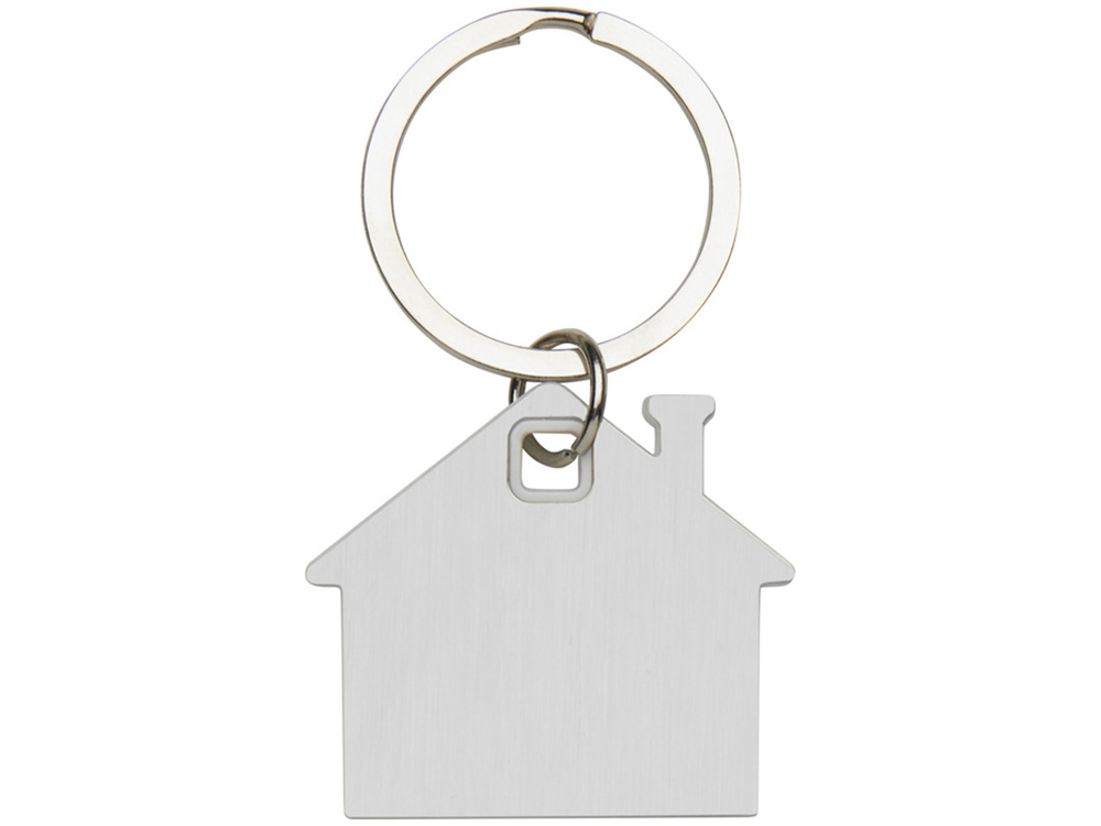 Брелок для ключей в форме домика с цветной вставкой из пластика между 2-мя серебристыми пластинами из стали.