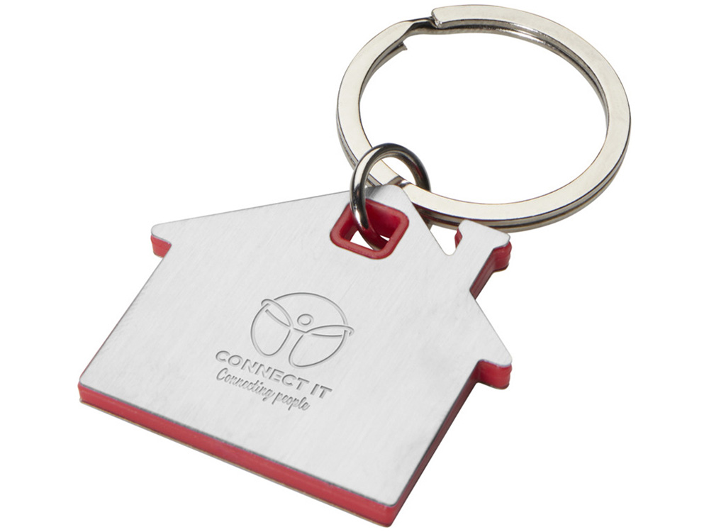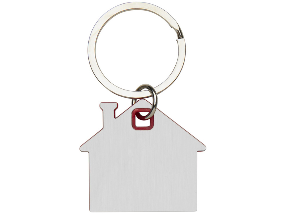 Брелок для ключей в форме домика с цветной вставкой из пластика между 2-мя серебристыми пластинами из стали.