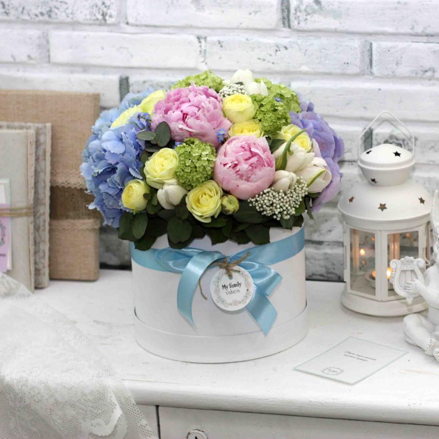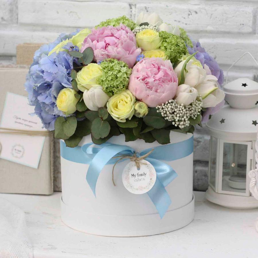 | пионы Сара Бернар, гортензия, тюльпаны, вибурнум, кустовые розы, эвкалипт; | |
