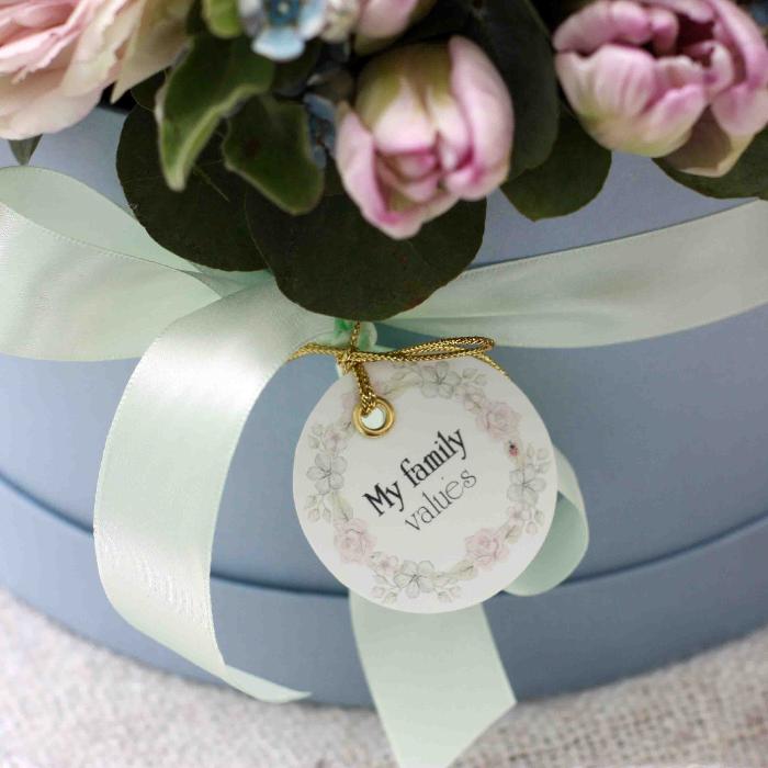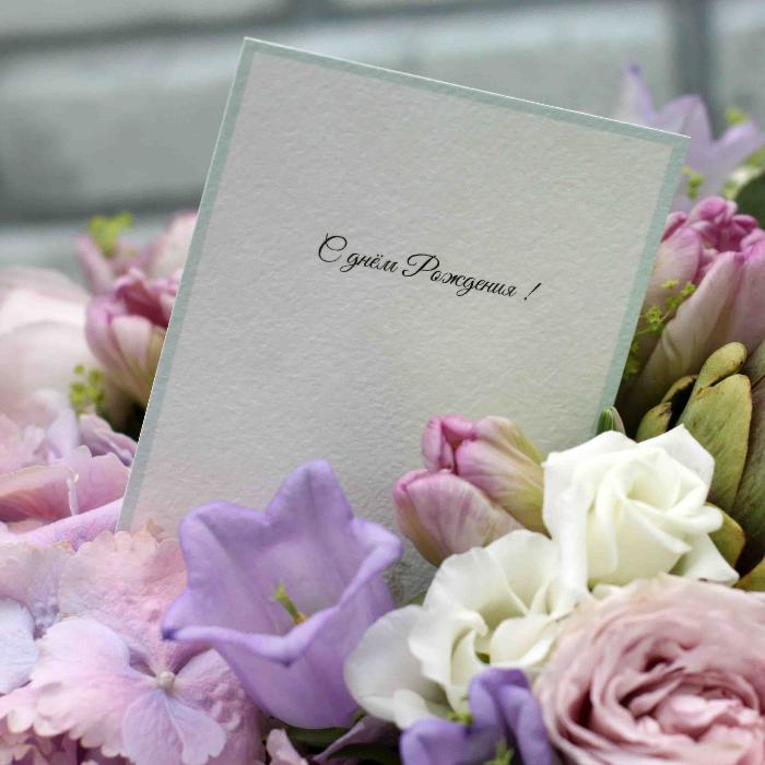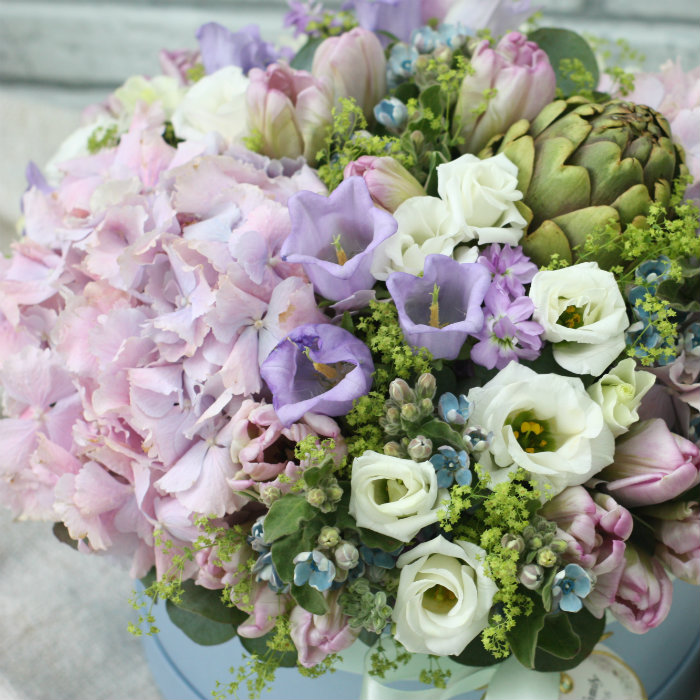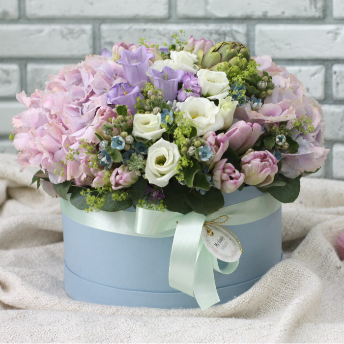 | Состав | гортензия, тюльпаны, незабудки, пионовидные розы, вибурнум, эвкалиптт; флористическая губка с влагой; фирменная упаковка. |