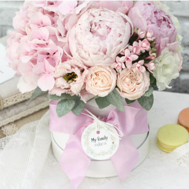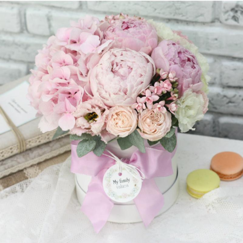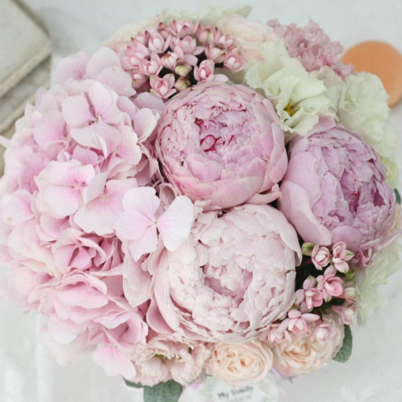 | пионы Сара Бернар, гортензия, эустома, кустовые розы, бовардия, эвкалипт; | |
