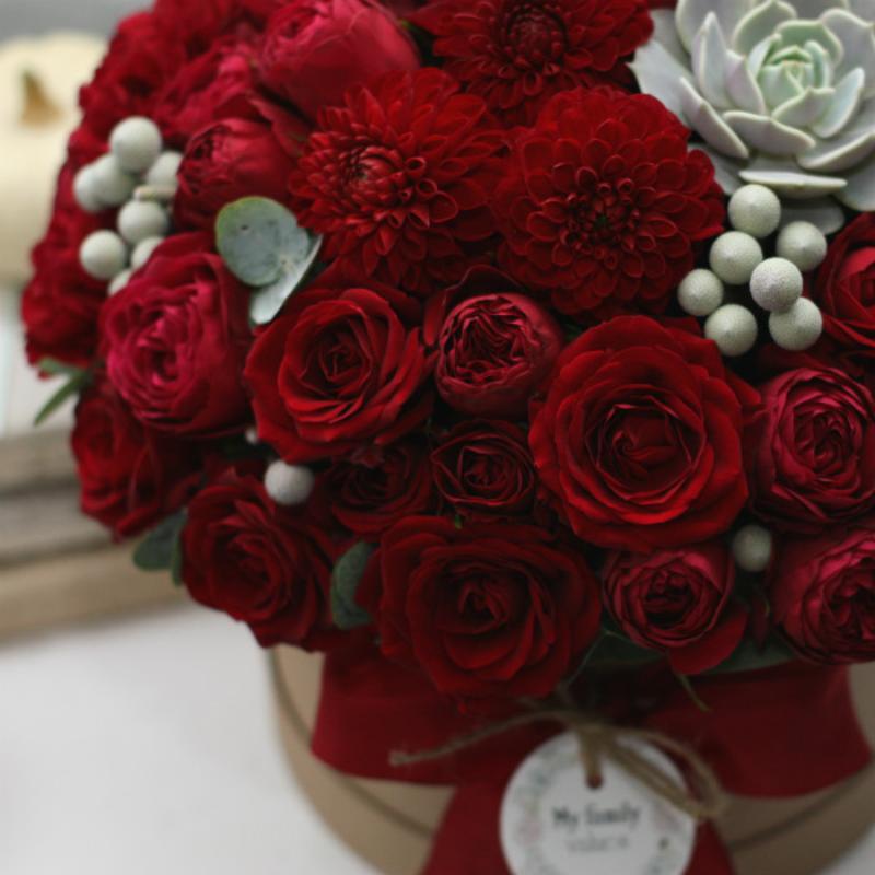 | ранункулюсы, розы Руби Джем, розы Пушкин, бруния, суккулент, эвкалипт; | |