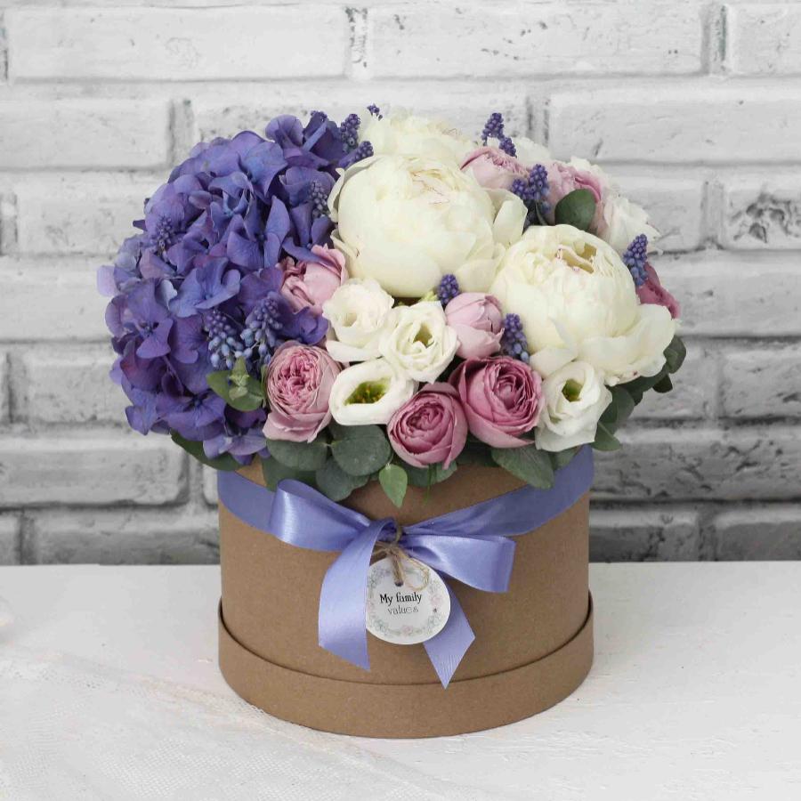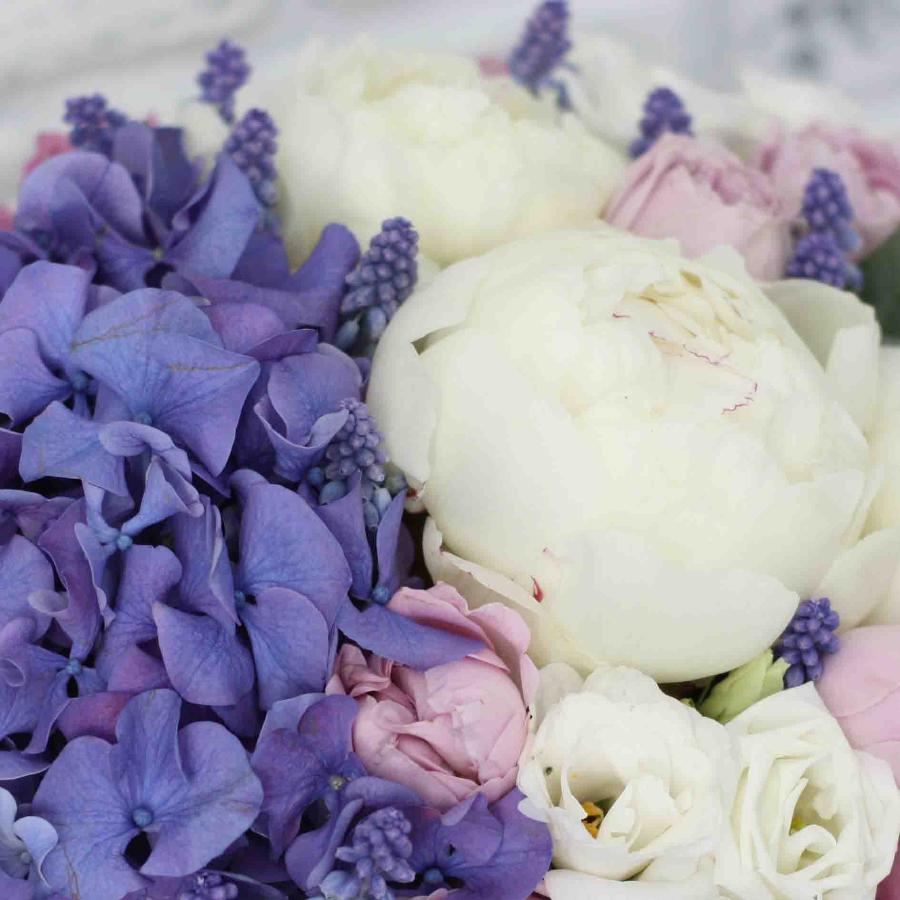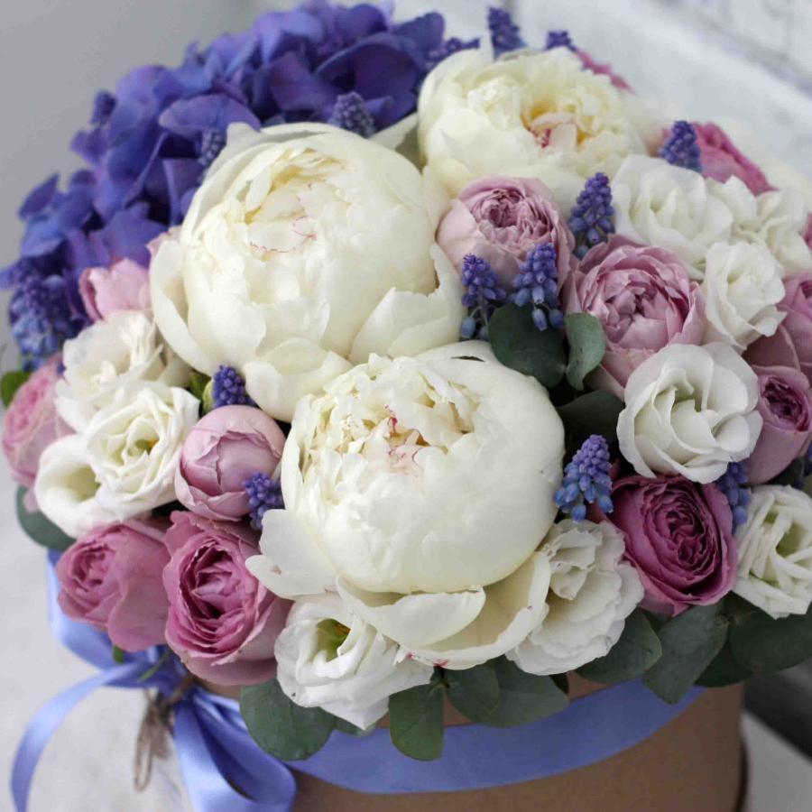 | пионы, гортензия, мускари, пионовидные розы, эустома, эвкалипт; | |