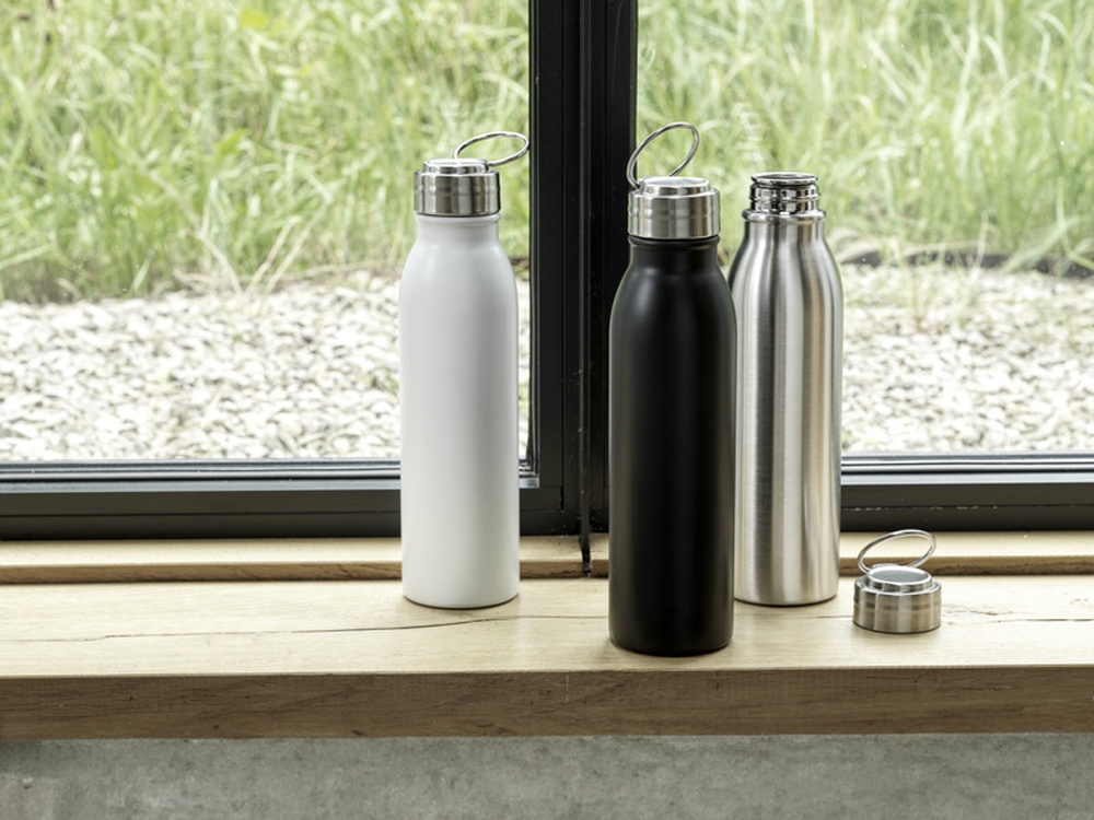 Одностенная бутылка для воды из нержавеющей стали, сертифицированной RCS, с завинчивающейся герметичной крышкой и прочной петлей для переноски из цинкового сплава. Не содержит БФА, протестирована и одобрена в соответствии с немецким законодательством о безопасности пищевых продуктов (LFGB). Проверена на содержание фталатов и одобрена для использования в соответствии с правилами REACH. Подходит для большинства стандартных автомобильных подстаканников. Объем 700 мл. Рекомендуется мыть вручную. Поставляется в подарочной коробке из переработанного картона. Recycled stainless steel, Recycled PP Plastic. Packaging: FSC Mix Credit P5.1 CU-COC-877277.