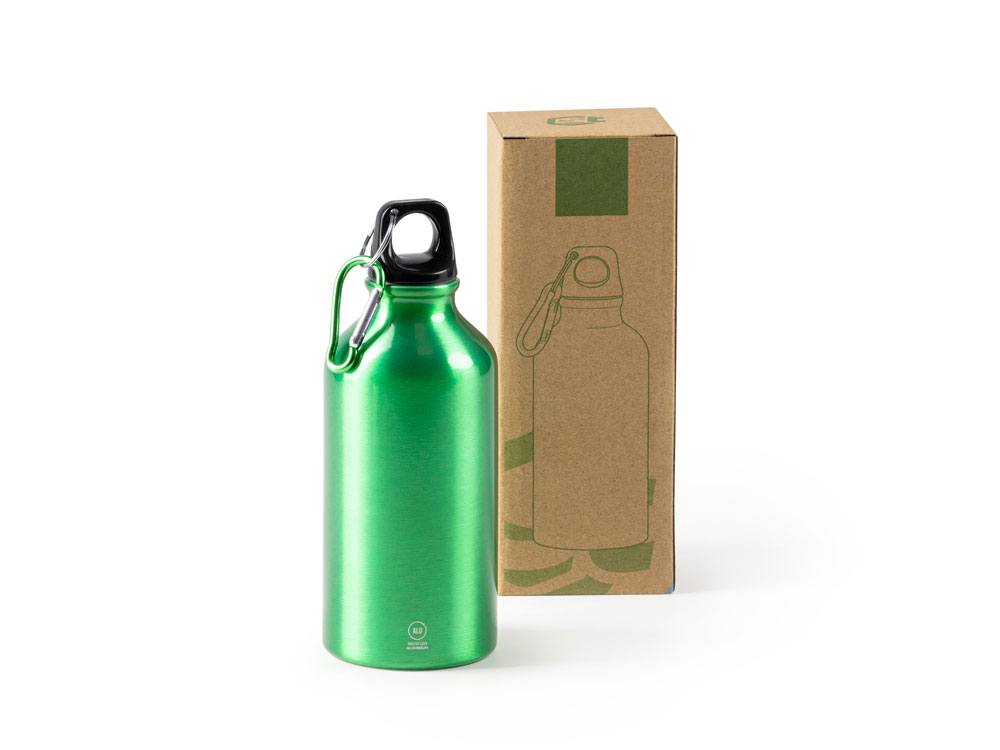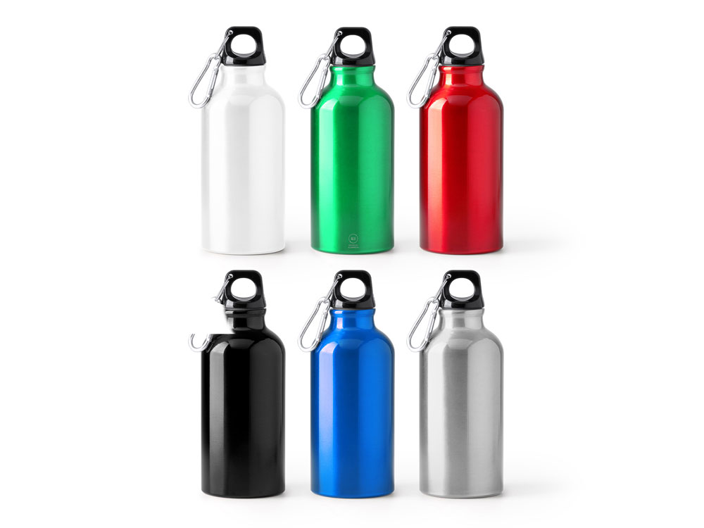 Бутылка из переработанного алюминия с карабином. Емкость 400 мл. Карабин для более удобной переноски бутылки, не рекомендуется для лазания.
