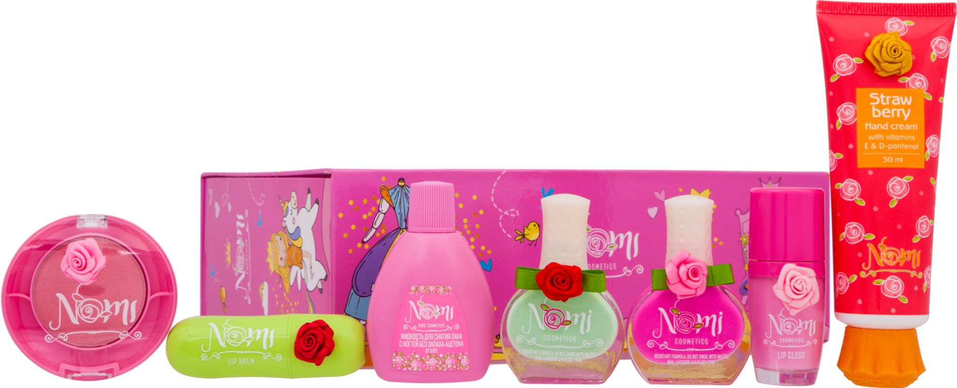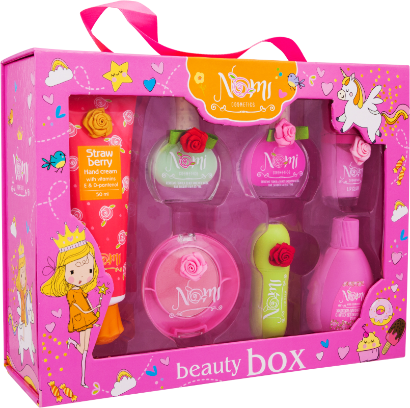 | В наборе | Лак для ногтей №22,Лак для ногтей №8, Жидкость для снятия лака ,Блеск для губ "Розовая мечта", Бархатные Румяна "Веселая бабочка", Крем для рук "Клубника", Бальзам для губ "Клубника". |