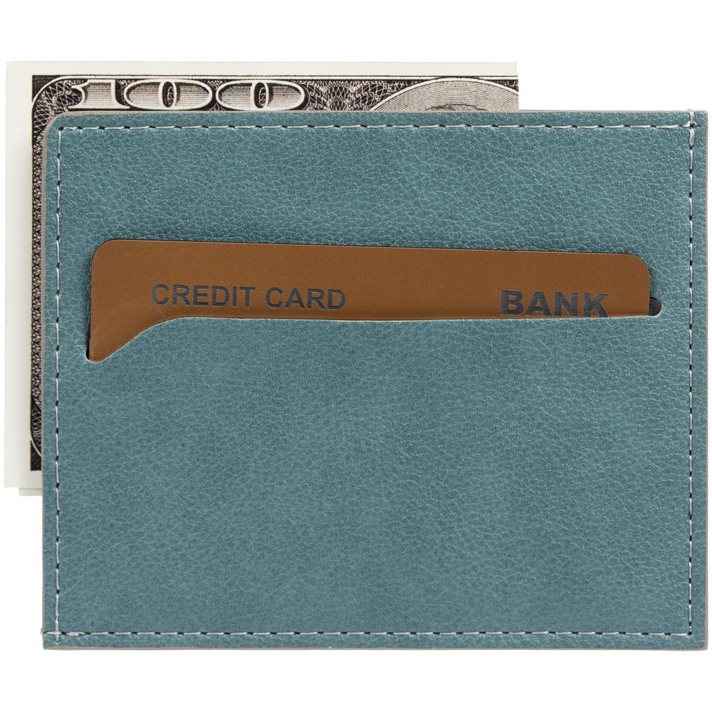 Чехол выполнен из материала Petrus, голубой JJ, дополнен окрашенным срезом края и внутренним карманом из серого картона. Имеет 4 отделения для кредитных карт и 1 отделение для купюр.
