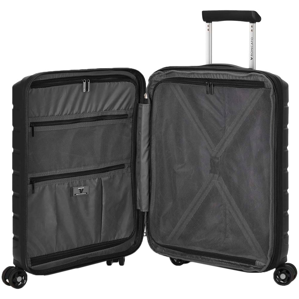 • Чемодан с 2 отделениями: одно отделение с сетчатым разделителем и прижимными ремнями, а второе оснащено перегородкой на молнии с двумя карманами