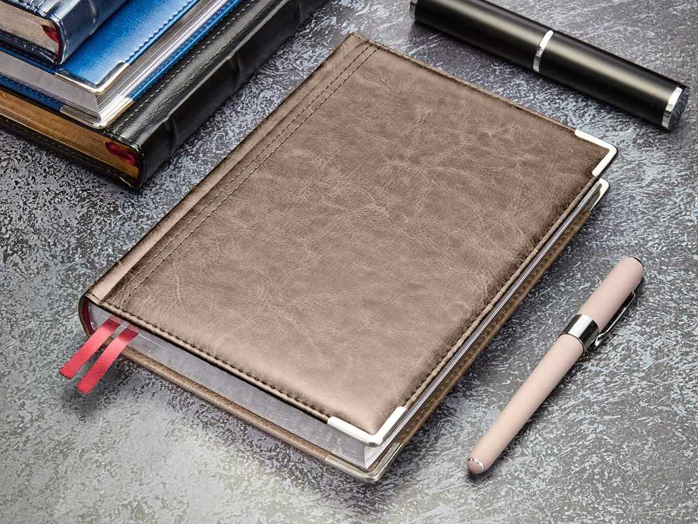 Полудатированный ежедневник Boss от бренда Bruno Visconti - это качественный корпоративный подарок по выгодной цене, произведенный специально под персонализацию. Представлен в универсальном формате А5 и состоит из 416 страниц. Классический деловой ежедневник линии Boss – образец элегантности. Гладкую тонкую фактуру экокожи подчеркивает декоративная строчка по контуру и металлические закругленные уголки золотистого цвета. В ежедневнике есть полезная справочная информация и телефонная книга, а также страницы для записи идей, мыслей и составления рабочих планов. Есть перфорация (нижние уголки отрывные). Для изготовления страниц используется качественный бежевый офсет повышенной плотности (80 г/кв м), которая производится японской фирмой Daiwa и подходит для всех видов чернил. Ежедневник можно персонализировать с помощью тиснения обложки - золотой или серебряной фольгой. Наши ежедневники помогут быть успешным и эффективным в карьере и повседневной жизни!