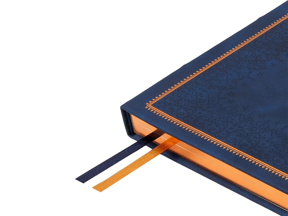 Недатированный ежедневник Royal формата А4 с твердой обложкой из искусственной кожи с имитацией нубука украшен художественным бронзовым и блинтовым тиснением. Внутри 192 страницы, выполненные из качественной бежевой бумаги в линейку плотностью 140 г/м². Два шелковых ляссе в цвет обреза блока и обложки облегчают навигацию по записям. Французский корешок дополнительно декорирован изящным бронзовым тиснением в виде виньеток. Скругленные углы обложки и блока подчеркивают стильный дизайн изделия, а блеск бронзового обреза дарит ежедневнику благородный и роскошный внешний вид.