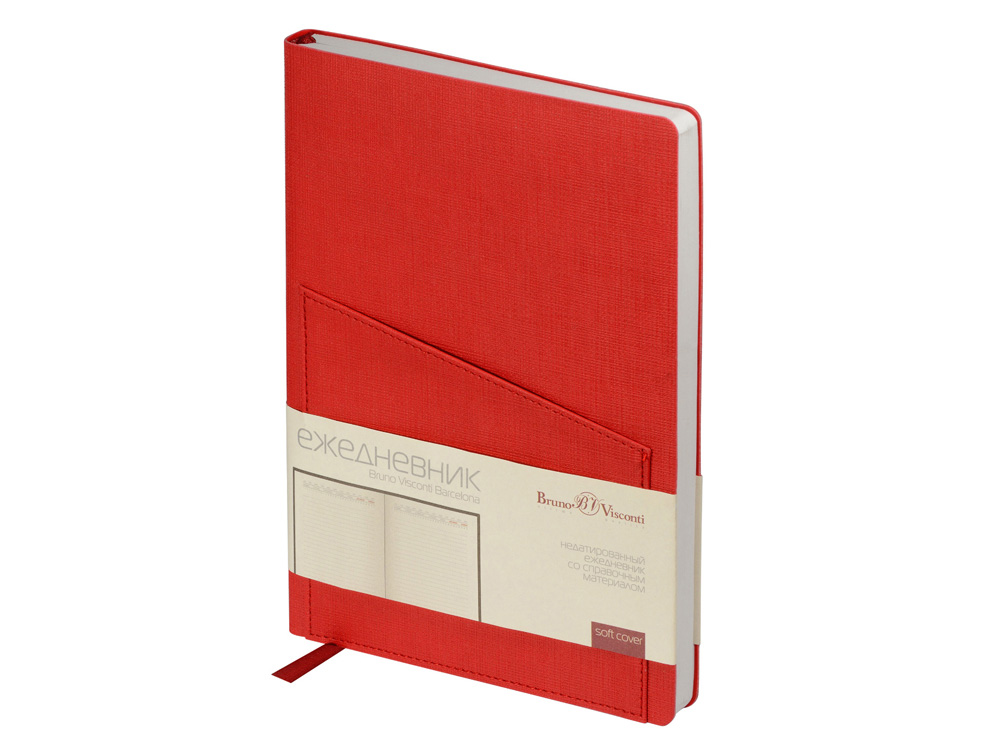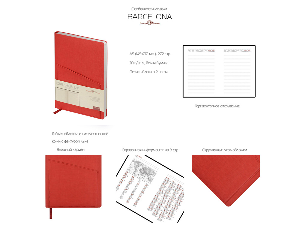 Это ежедневник предназначен для тех, кто отдает предпочтение строгости. Телефон, ручка, визитки и листы для записей будут всегда под рукой благодаря удобному карману на фронтальной стороне. В недатированном ежедневнике Barcelona красного цвета используется белая бумага плотность 70 г/м. Ляссе благородного бордового цвета сочетается с обложкой. Скругленный угол - фирменная особенность ежедневников Bruno Visconti. Справочная информация на 8 страницах. Ежедневник Barcelona упаковывается в картонный полукороб и термопленку.