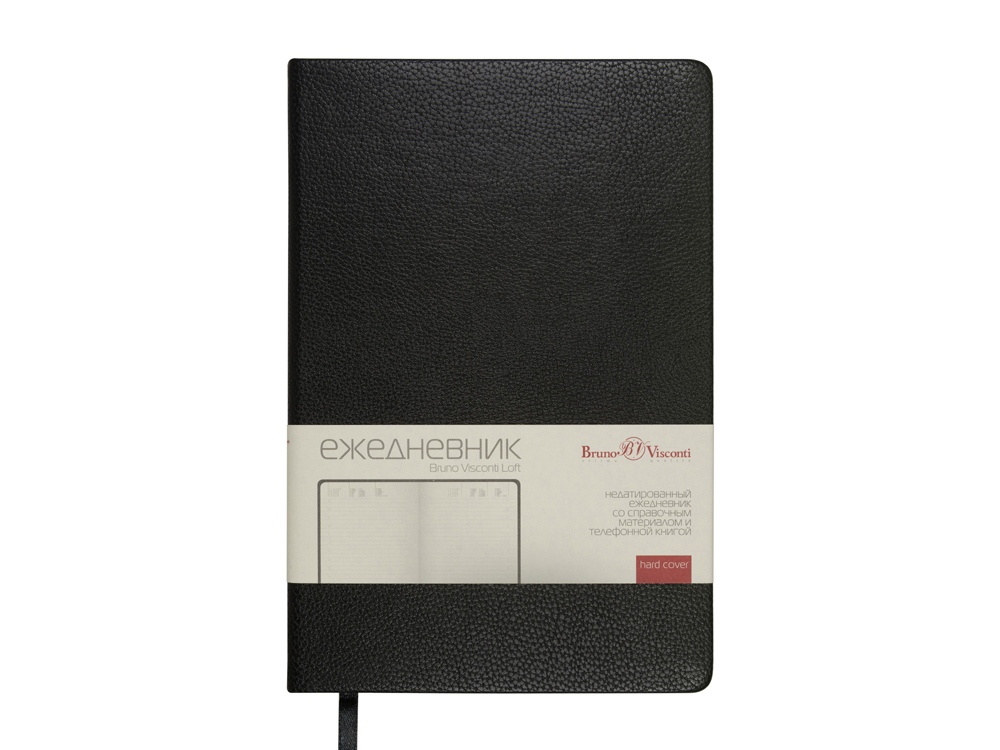Недатированный ежедневник Loft формата А5 от Bruno Visconti - идеальный баланс между стилем и практичностью. Твердая обложка из высококачественной экокожи максимально повторяет фактуру натуральной кожи. Скругленные углы блока и обложки позволяют уберечь листы от замятий и придают ежедневнику утонченности и благородства. Для удобства навигации предусмотрена закладка-ляссе в цвет обложки. Внутренний блок ежедневника содержит справочную информацию на 19 страницах, телефонную книгу на 26 страницах и блок для ежедневного планирования в линейку с указанием времени суток (интервал в один час). Блок изготовлен из бежевой бумаги плотностью 70 г/кв.м.
