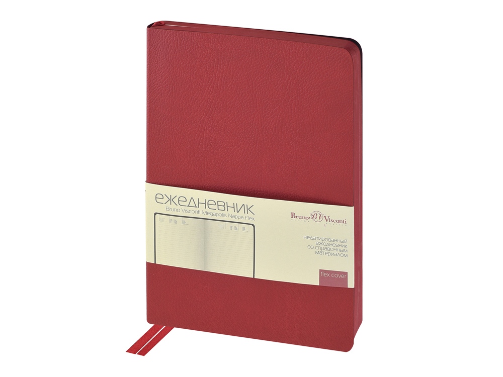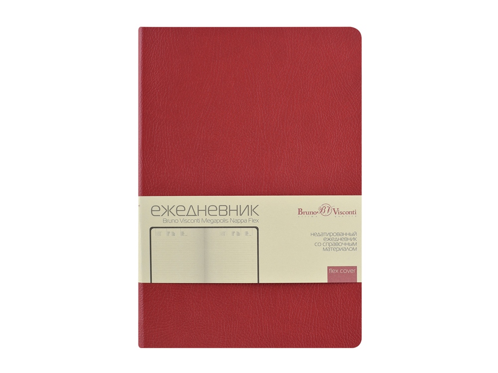 Обложка недатированного ежедневника Megapolis Nappa Flex ТМ Bruno Visconti произведена из искусственной кожи без применения переплетного картона, благодаря чему он легче и изящнее классических. Его можно свернуть в трубочку, обложка и блок не пострадают. При этом, для ежедневника формата А5 доступны те же опции, что и для любых других ежедневников — окрашенный обрез, крупнозернистая фактура искусственной кожи обложки, двойное ляссе 7 мм. Блок изготовлен из бежевой бумаги плотностью 70 г/м2 и помимо раздела для планирования рабочего времени включает в себя 12 страниц справочной информации.
