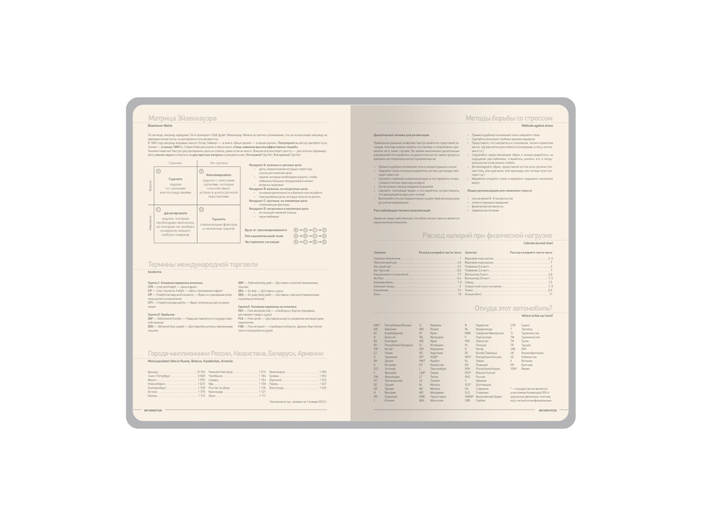 Обложка недатированного ежедневника Megapolis Nappa Flex ТМ Bruno Visconti произведена из искусственной кожи без применения переплетного картона, благодаря чему он легче и изящнее классических. Его можно свернуть в трубочку, обложка и блок не пострадают. При этом, для ежедневника формата А5 доступны те же опции, что и для любых других ежедневников — окрашенный обрез, крупнозернистая фактура искусственной кожи обложки, двойное ляссе 7 мм. Блок изготовлен из бежевой бумаги плотностью 70 г/м2 и помимо раздела для планирования рабочего времени включает в себя 12 страниц справочной информации.