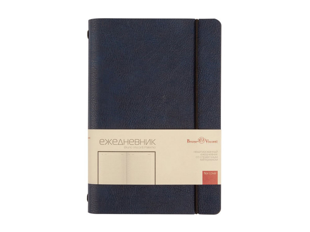 Недатированный ежедневник Bruno Visconti Palermo формата А5 с гибкой (flex) обложкой – практичный помощник в деле планирования рабочего времени для деловых людей, живущих в ритме мегаполиса. Отличительной особенностью ежедневника является горизонтальная, скрепляющая обложку и блок, тоненькая резинка. Оригинальное решение позволяет раскрывать ежедневник на 180 градусов и вести записи у самого края корешка. Для фиксации второй резинки, не позволяющей ежедневнику раскрываться, предусмотрена выемка на обложке. Обложка тонка, но фактурность придает ей элемент брутальности, а бархатистое нанесение на ее оборотной стороне- благородство и статусность. Картонный карман для визиток, записок, бумаг – функциональная деталь и приятная дополнительная опция. Бумажный блок изготовлен из бумаги бежевого цвета, плотностью 70 г/кв.м и содержит 272 страницы, 23 из которых справочная информация.