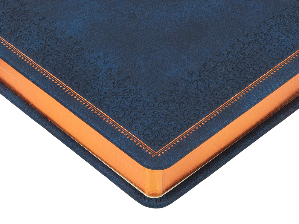 Недатированный ежедневник Royal формата А5 с твердой обложкой из искусственной кожи с имитацией нубука украшен художественным бронзовым и блинтовым тиснением. Внутри 256 страниц, выполненных из качественной бежевой бумаги в линейку плотностью 100 г/м². Два шелковых ляссе в цвет обреза блока и обложки облегчают навигацию по записям. Французский корешок дополнительно декорирован изящным бронзовым тиснением в виде виньеток. Скругленные углы обложки и блока подчеркивают стильный дизайн изделия, а блеск бронзового обреза дарит ежедневнику благородный и роскошный внешний вид.