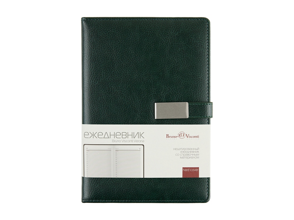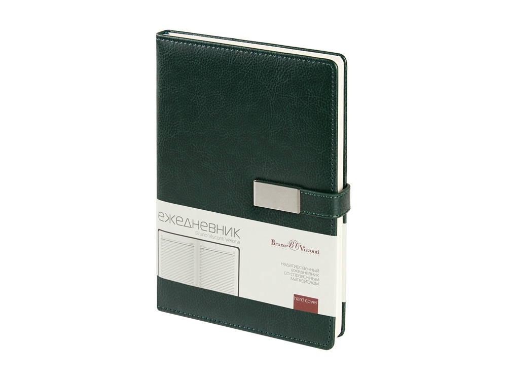 Казалось бы, утилитарный ежедневник Verona формата А5 со стандартным набором характеристик: петля для руки, ляссе в цвет обложки, скругленные углы блока и обложки. Но благодаря маленькой детали - металлическому хлястику на магните, ежедневник выглядит ярко и привлекательно. Ежедневник комфортно и приятно держать в руках благодаря поролонированной обложке из высококачественной искусственной кожи. Блок из 256 страниц ежедневника произведен из бежевой бумаги плотностью 80 г/кв.м, содержит помимо недатированных страниц для планирования рабочего времени еще и справочную информацию.