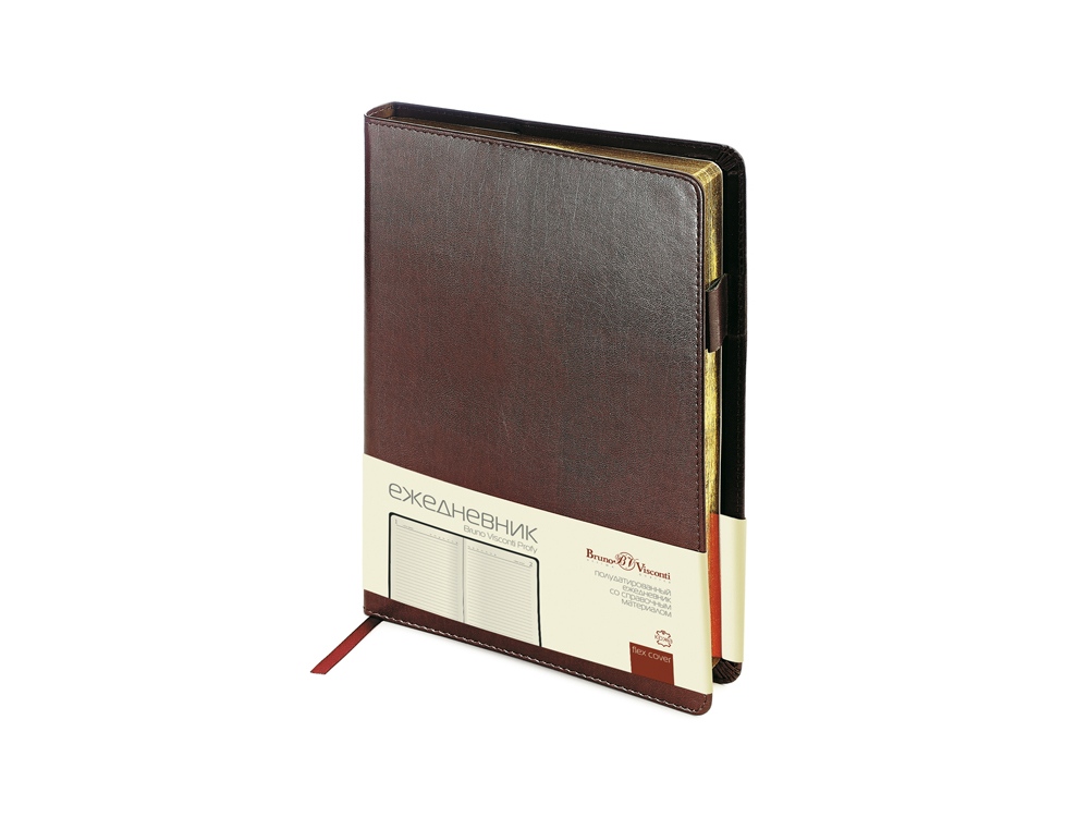 Незаменимый помощник современного профессионала – стильный и презентабельный ежедневник линии Profy. Обложка с прострочкой по периметру выполнена из натуральной рециклированной кожи и является съемной. Ежедневник формата А5 выпускается размером 143*216 мм. Полудатированный сменный блок включает 416 страниц бежевого цвета. Их закругленные уголки совпадают с формой обложки, обрез золотого цвета. Используется бумага высшего качества с плотностью 70 грамм. На 32 страницах помещена справочная информация. Последние 8 листов являются отрывными и снабжены перфорацией. Для хранения письменной принадлежности представлена специальная петля из кожи. Для быстрого перехода по страницам под обложкой находится бордовая закладка-ляссе. Поставляется в индивидуальной упаковке.