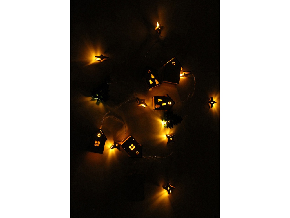 | Комплектность | домик- 5 шт., елочка- 2 шт., звездочка- 8шт., лампочка (горит желтым цветом)- 15шт. |