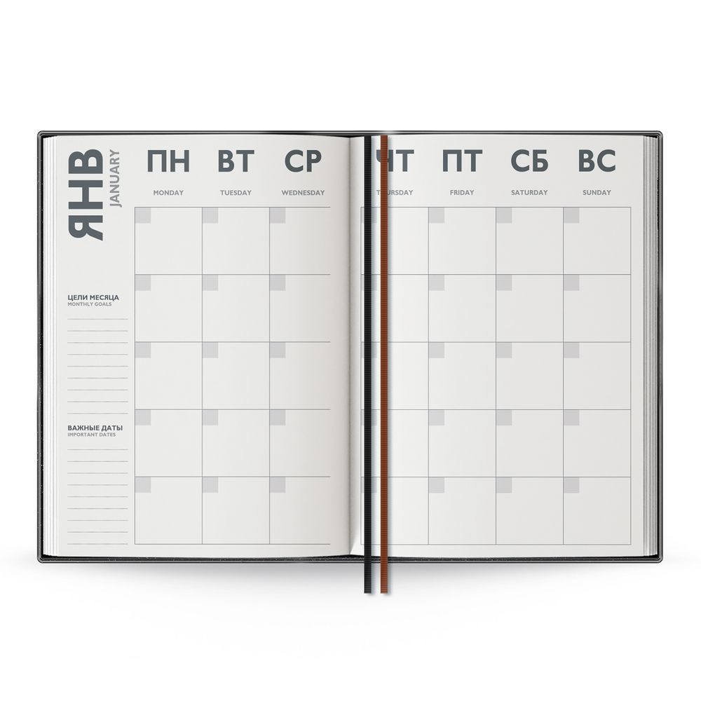 Ежедневник с гибкой обложкой и закладкой из искусственной кожи, дополнен капталом и двойным ляссе.