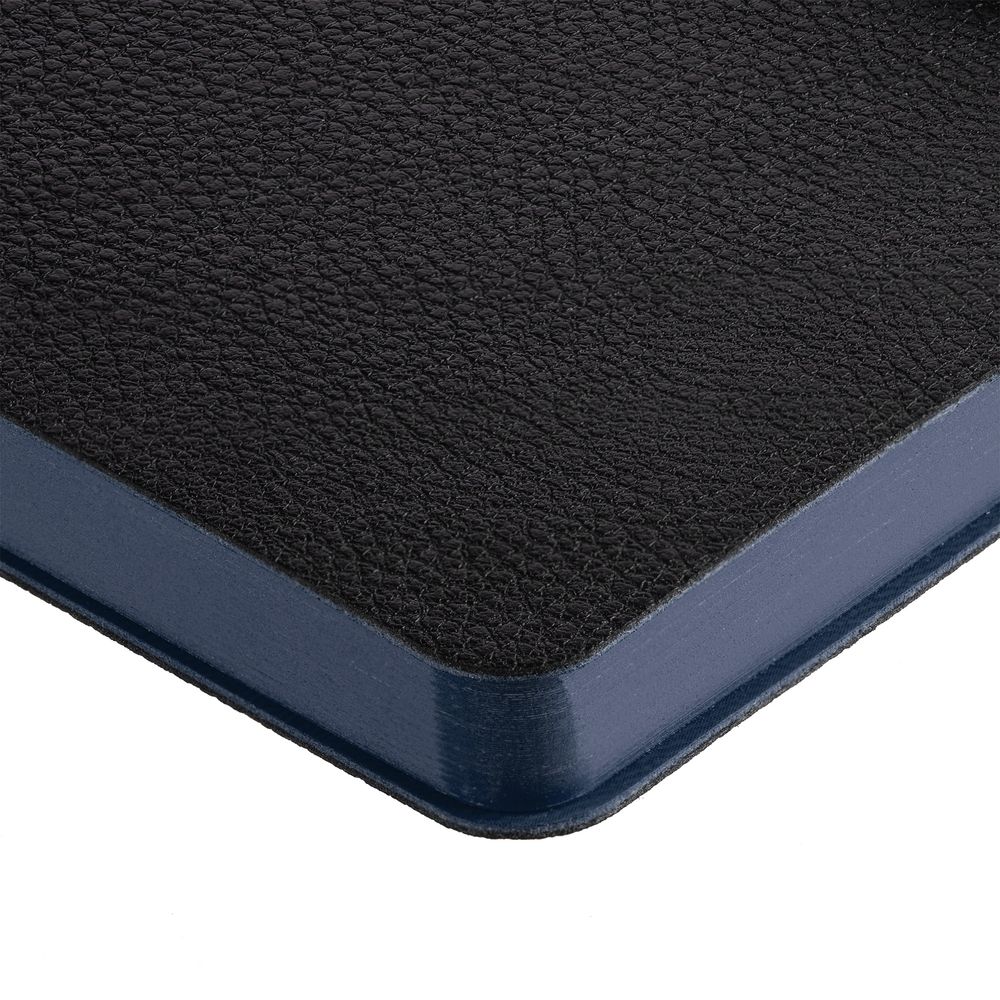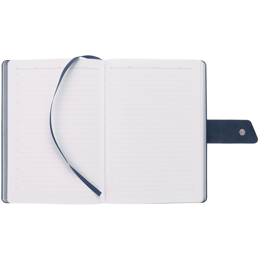 Ежедневник с гибкой обложкой, выполнен из материала La Fite, черный АА и Nubuck, темно-синий ХХ, дополнен синим ляссе и хлястиком на кнопке.