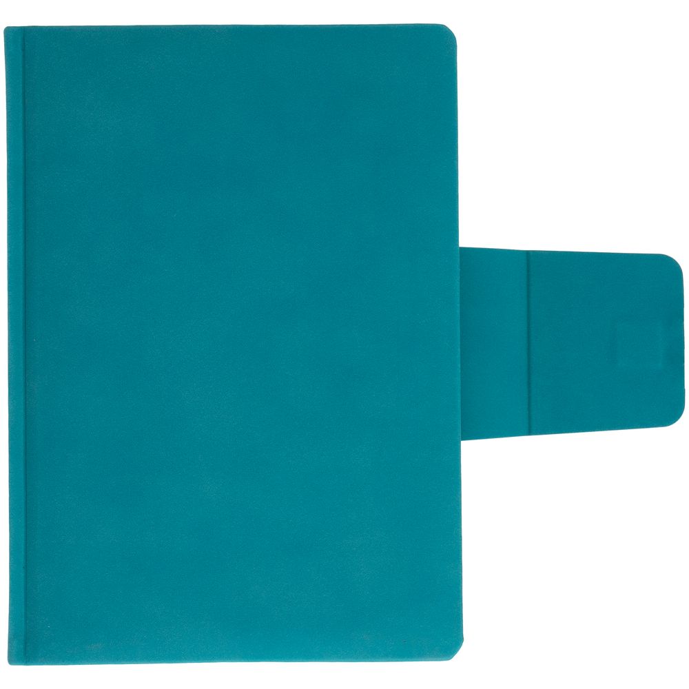 Ежедневник с твердой обложкой c поролоном, выполнен из материала Nubuck, морской волны, дополнен капталом и ляссе бирюзового цвета. Застежка — хлястик на магните.