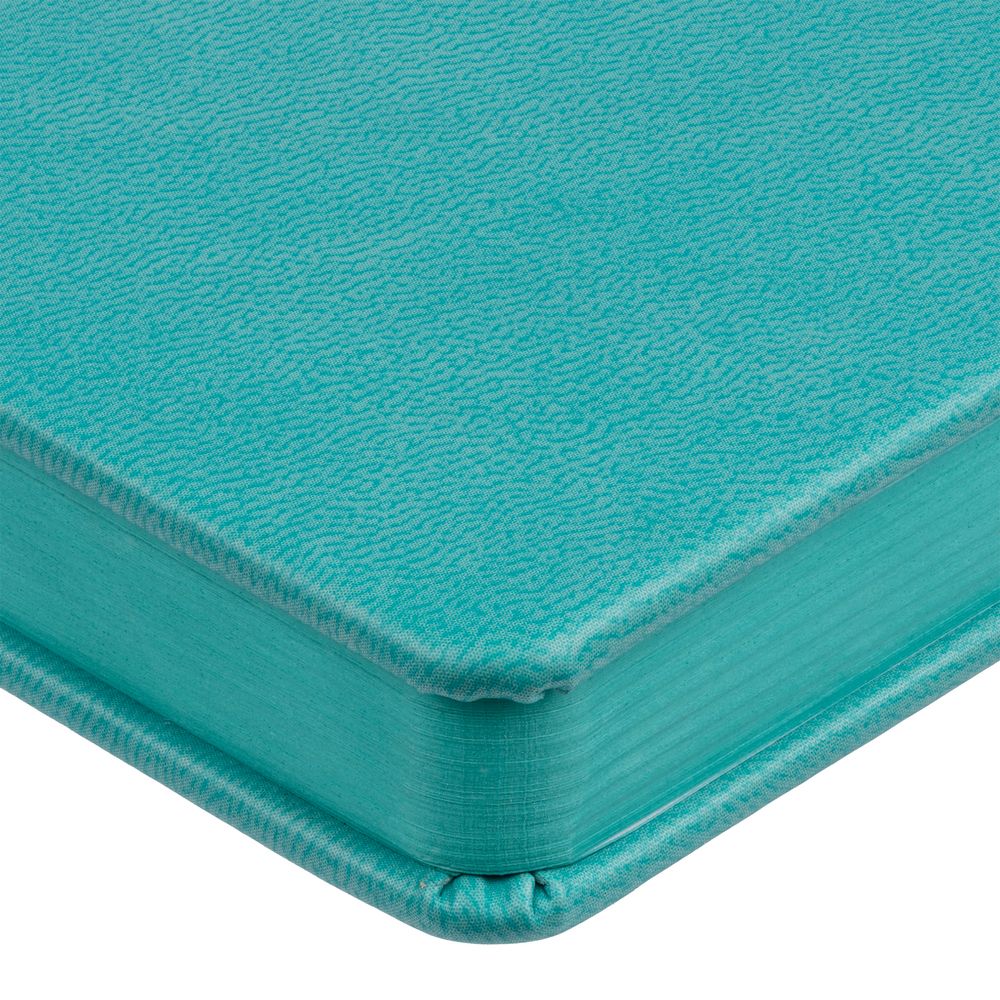 Ежедневник с твердой обложкой и тонированным обрезом. Выполнен из материала Latte, бирюзовый, дополнен ляссе в цвет обложки.
