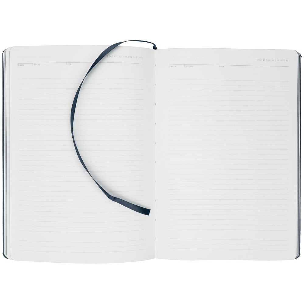 Ежедневник с твердой обложкой и тонированным обрезом. Выполнен из материала Latte, темно-синий, дополнен ляссе в цвет обложки.