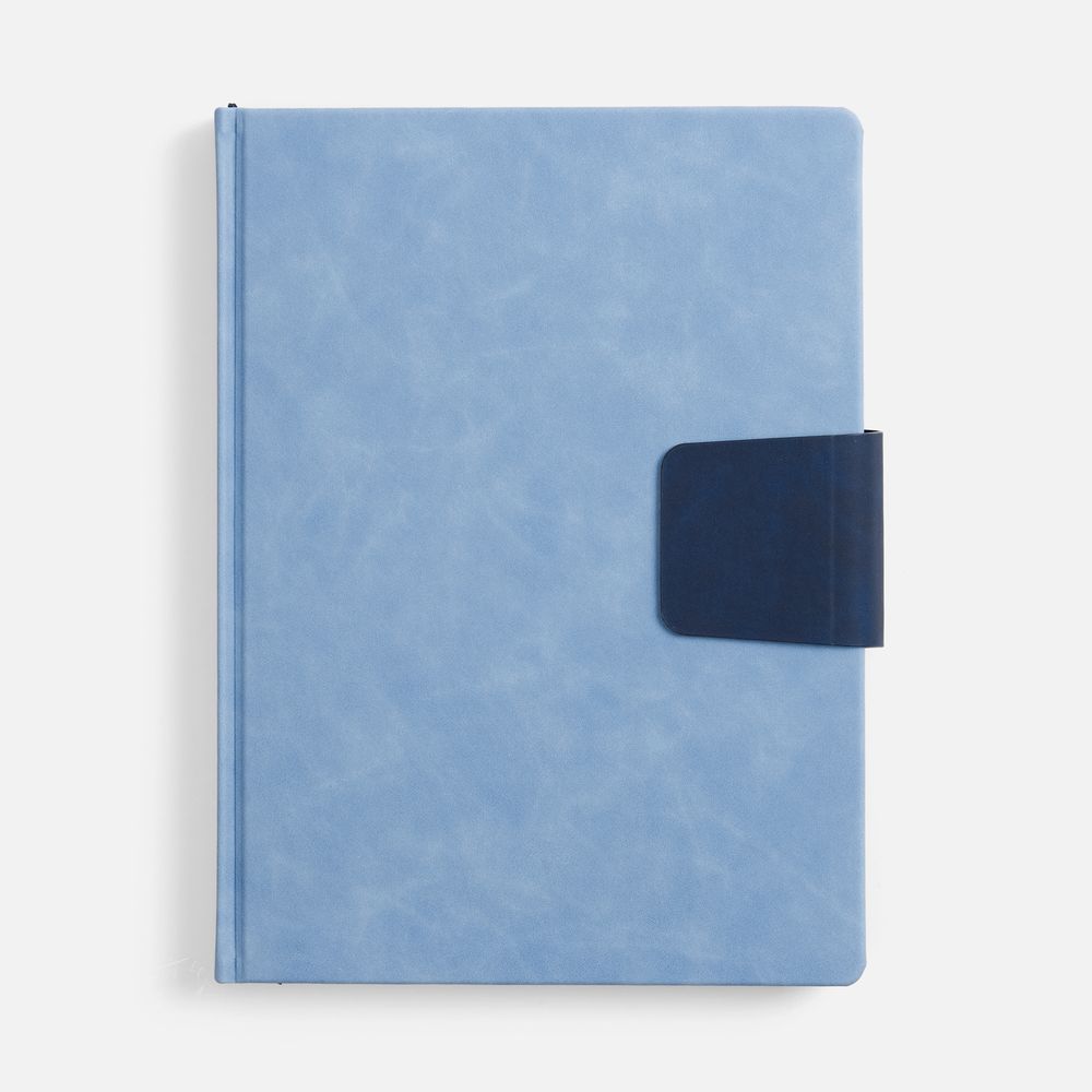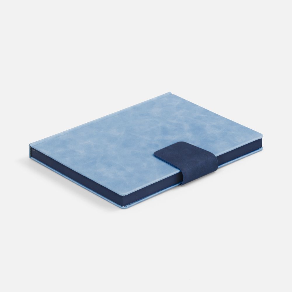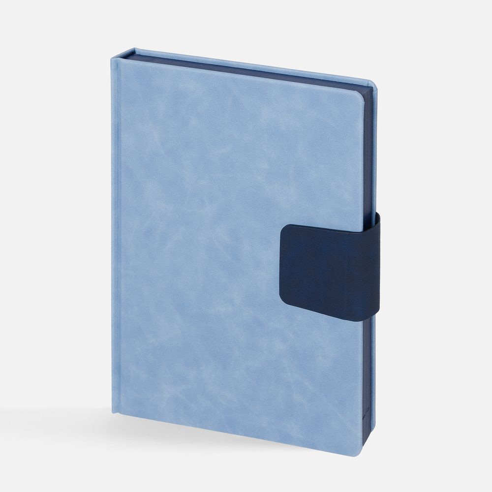 Ежедневник с твердой обложкой, выполнен из материала Nubuck Touch, голубой JJ, дополнен капталом, ляссе и обрезом синего цвета. Застежка — хлястик на магните из материала Nubuck Touch, темно-синий ХХ.