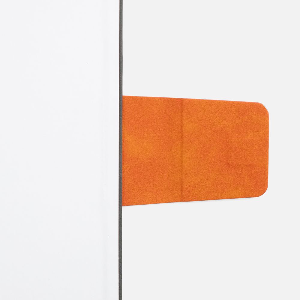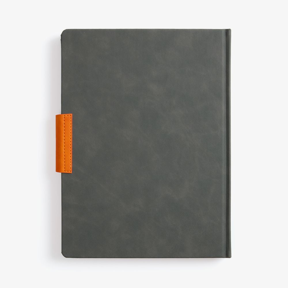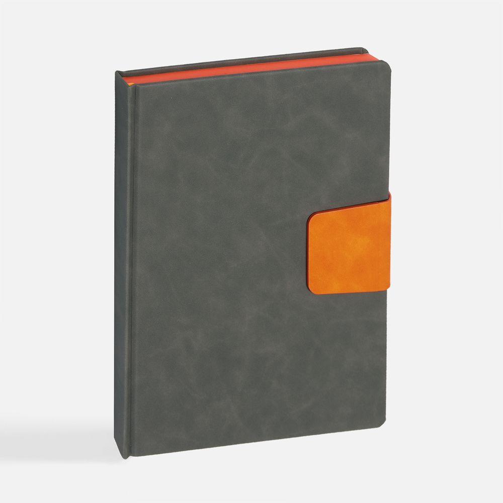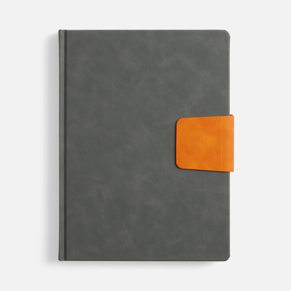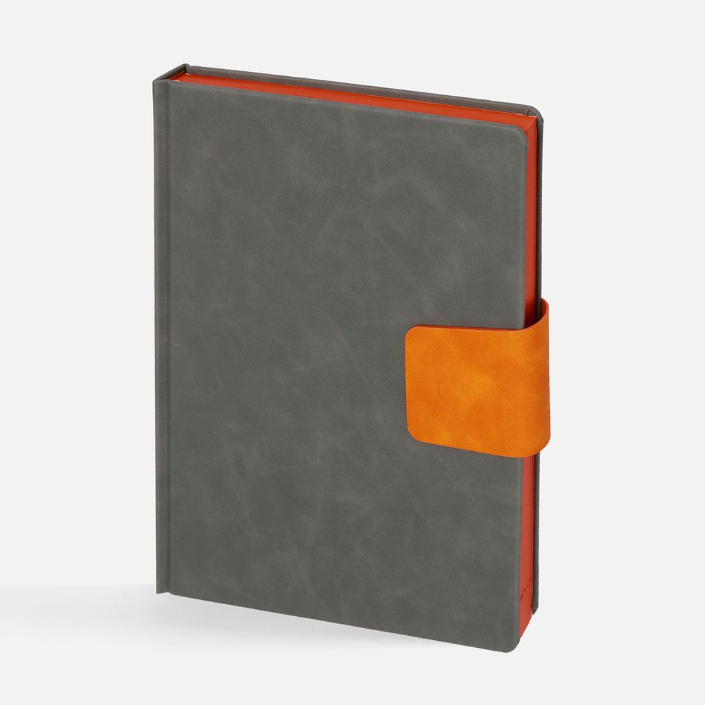 Ежедневник с твердой обложкой, выполнен из материала Nubuck Touch, серый СС, дополнен капталом, ляссе и обрезом оранжевого цвета. Застежка — хлястик на магните из материала Nubuck Touch Ultra, оранжевый ОО.