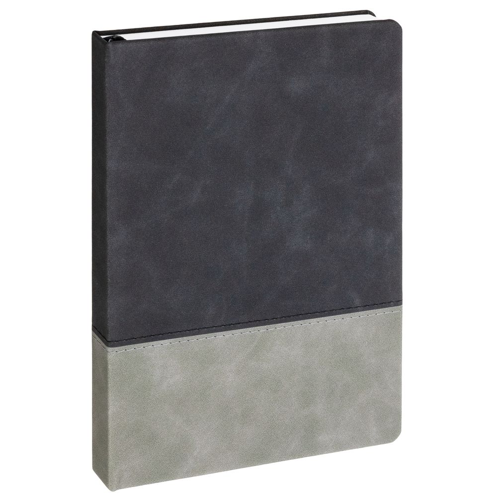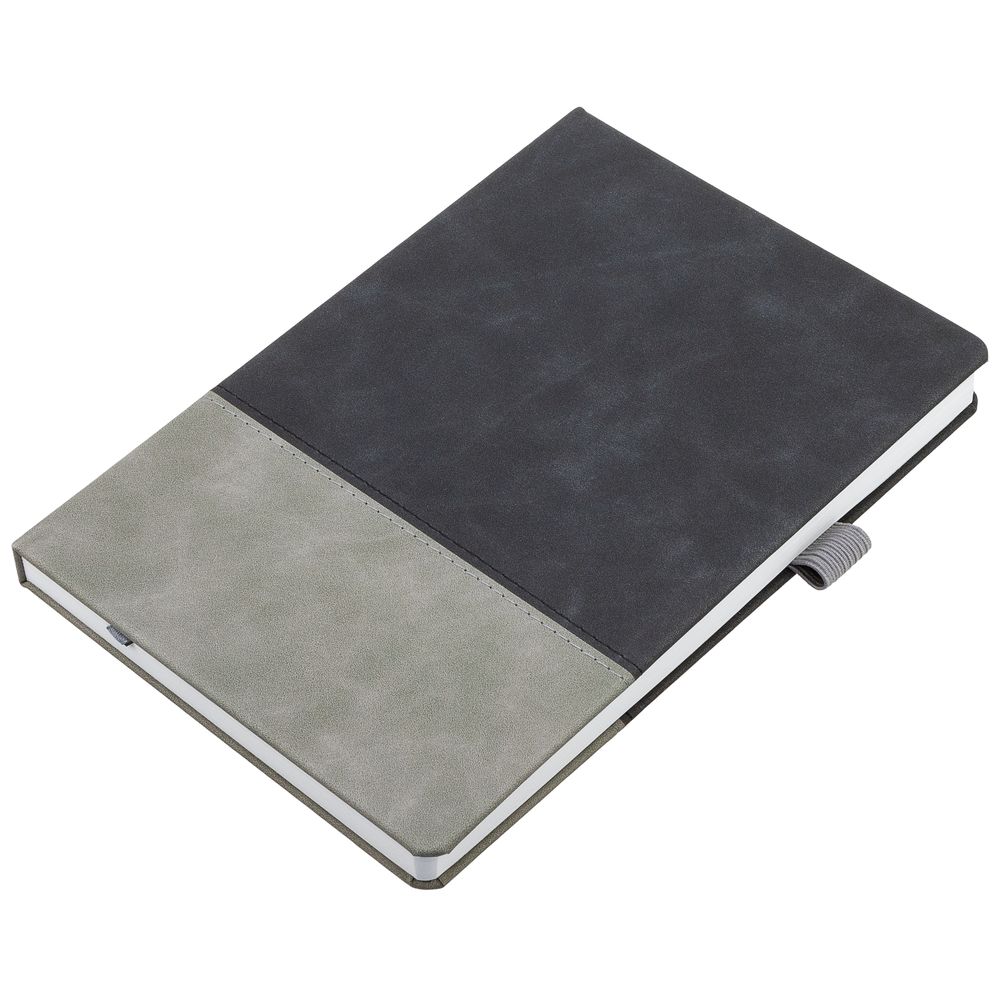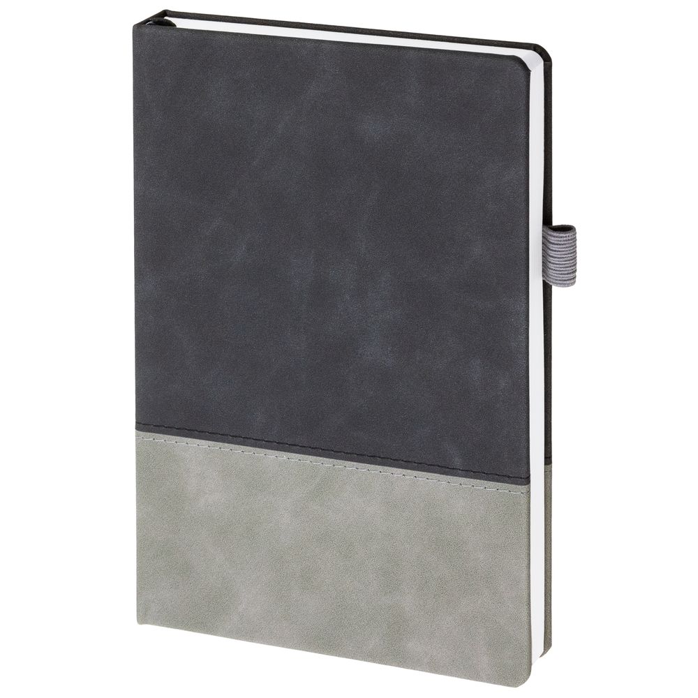 Ежедневник с твердой обложкой, без поролона, со сшивкой материалов Nubuck Touch, серый СС, и Nubuck Touch черный АА, дополнен двойным ляссе и петлей-резинкой для ручки.